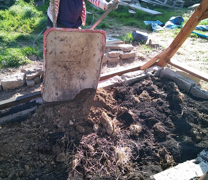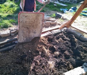 Après avoir gratté la terre battue, nous avons déposé « quelques » brouettes de matière en lasagnes : paille, lisier, terre, compost.