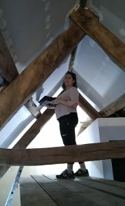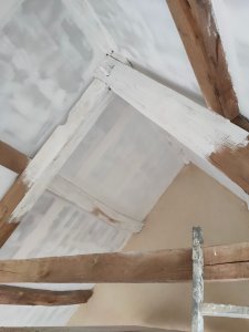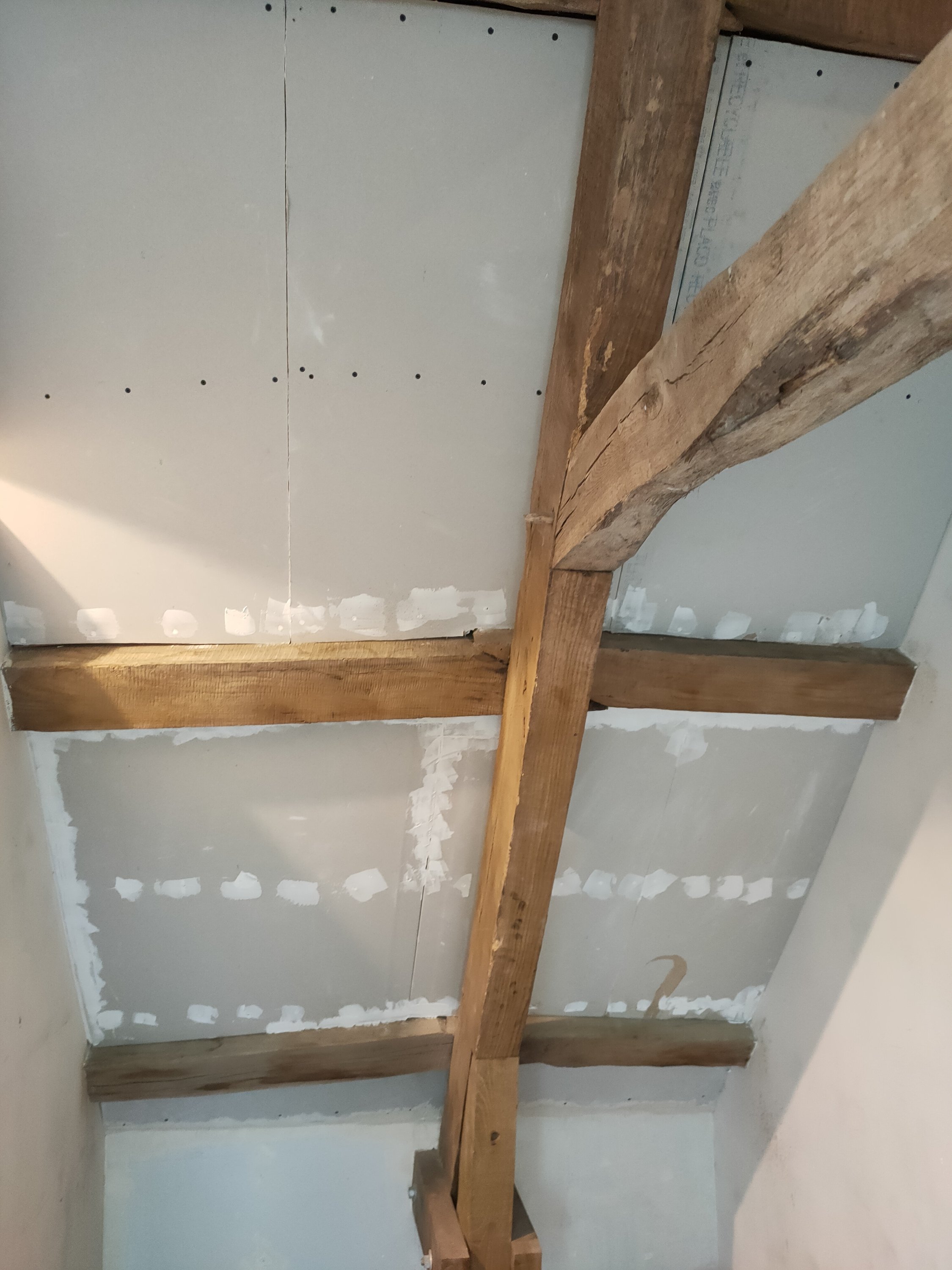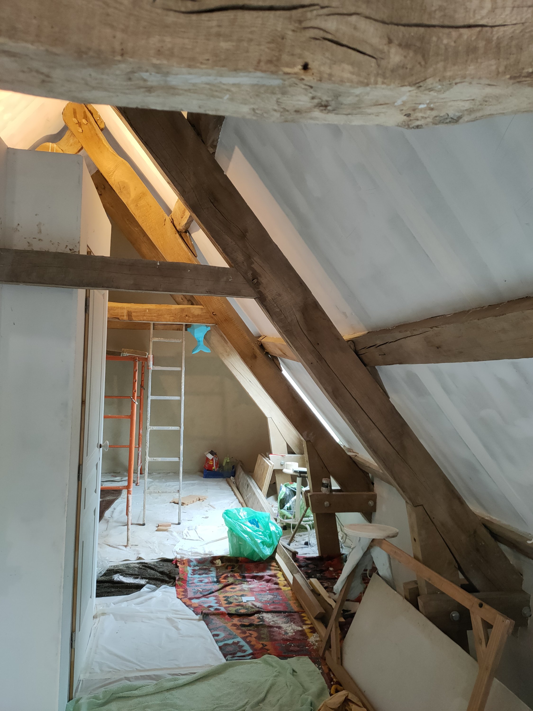 Nous avons décidé de peindre tout le plafond même là charpente en blanc. Le bois étant difficile à regagner et d’époque. Même avec un nettoyage des pannes, la crasse sort encore à travers de la sous-couche.