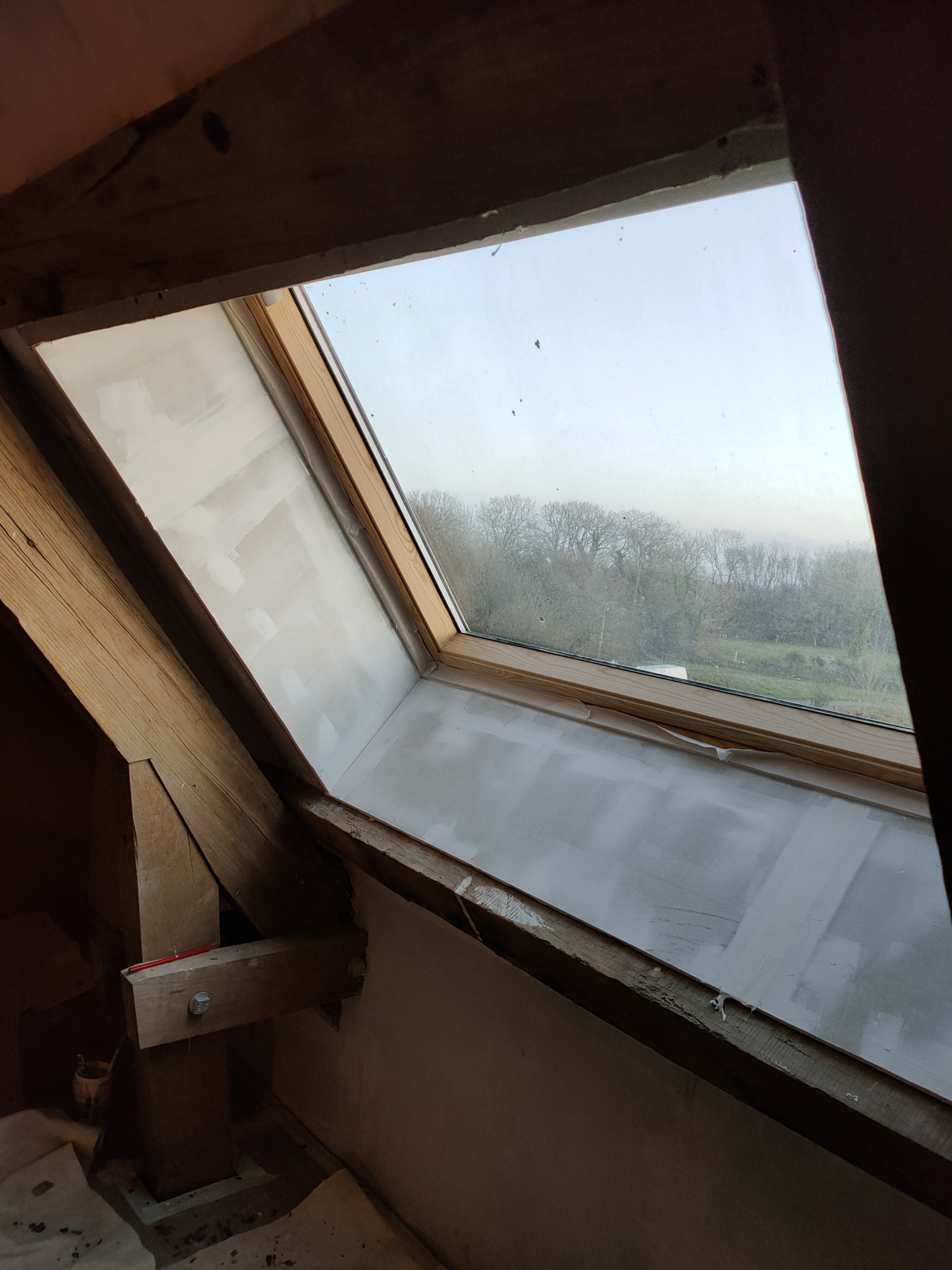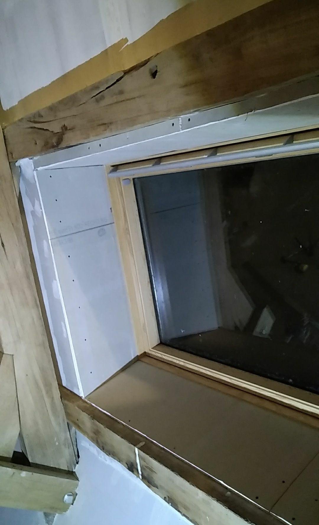Zone un peu abandonnée aussi, les tours des velux. Gwen a repris le placo pour finaliser les bords. Même sans enduit le rendu est bien plus fini. Et entre temps, j’ai ajouté les bandes et l’enduit, reste le ponçage et la peinture.