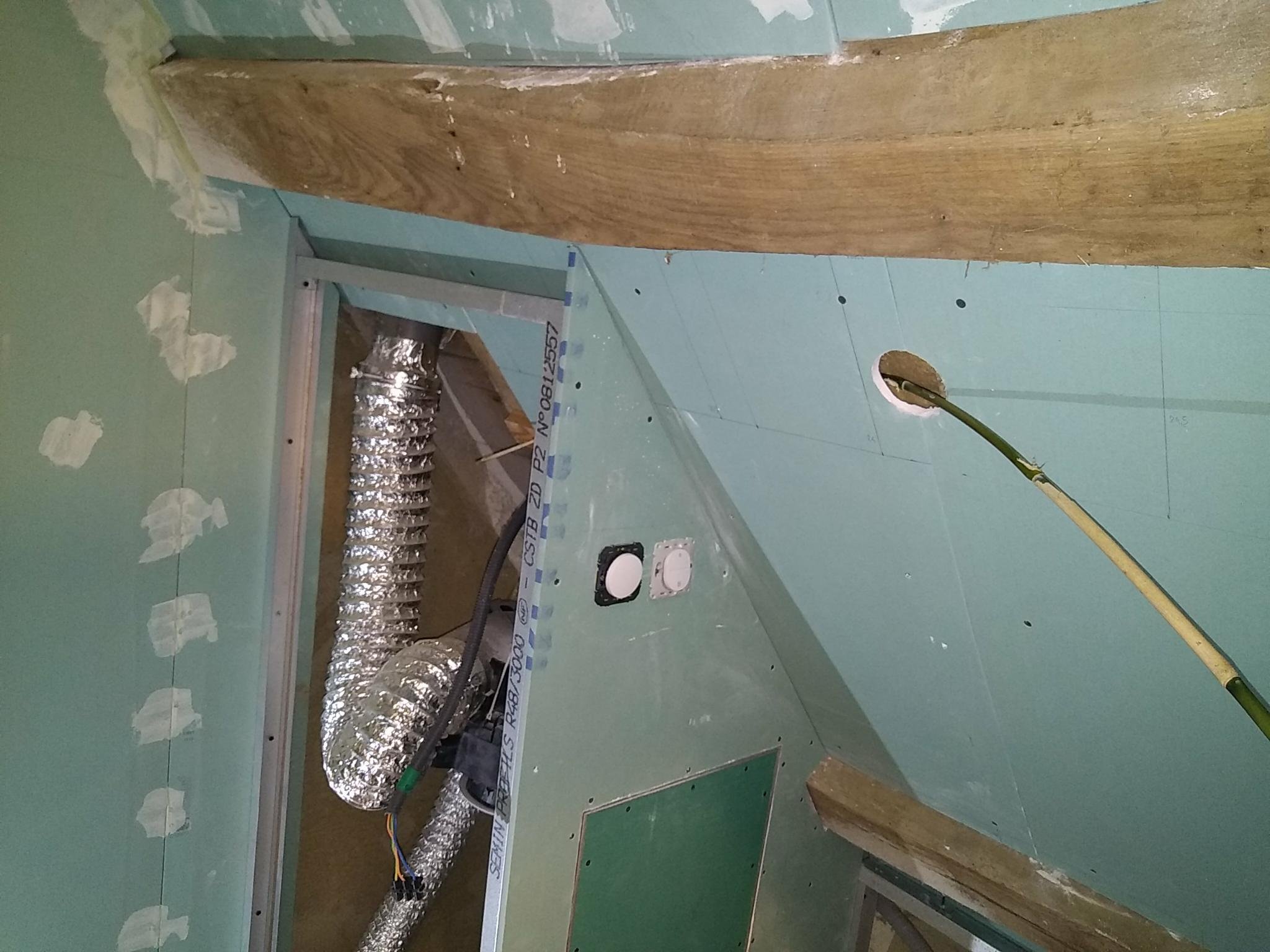 Au final la vmc est bien cachée, l’espace de la douche est dessiné et les prises et appliques ont pris place.