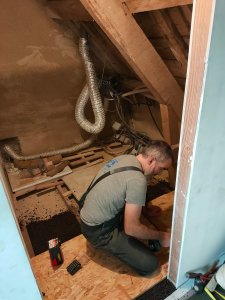 Juste avant la fin de l’année, Gwen s’est mis à la pose du sol de la salle d’eau. Après une petite rétro sur les arrivées électriques, il a posé les plaques d’osb qui étaient en attente depuis deux ans.