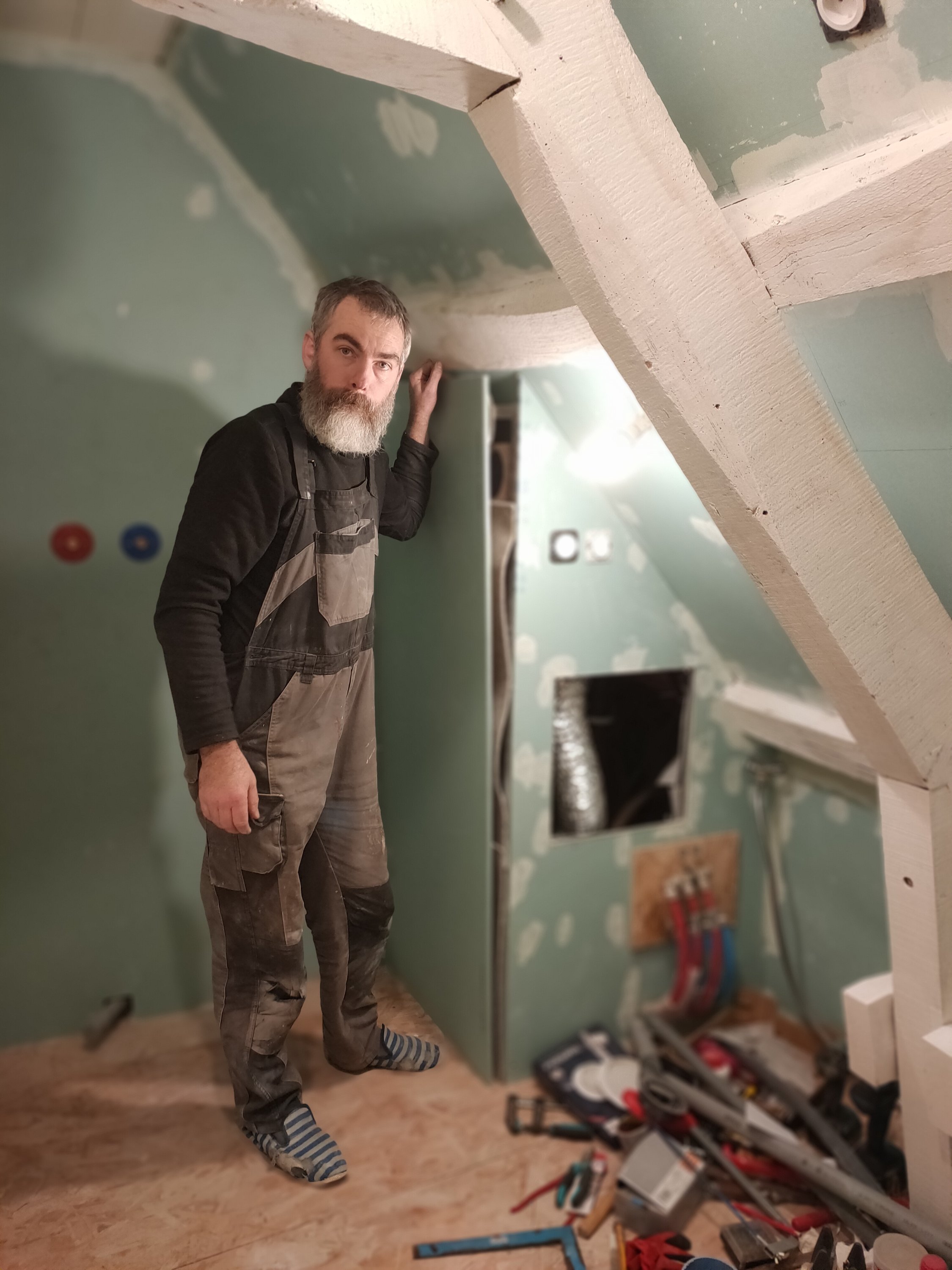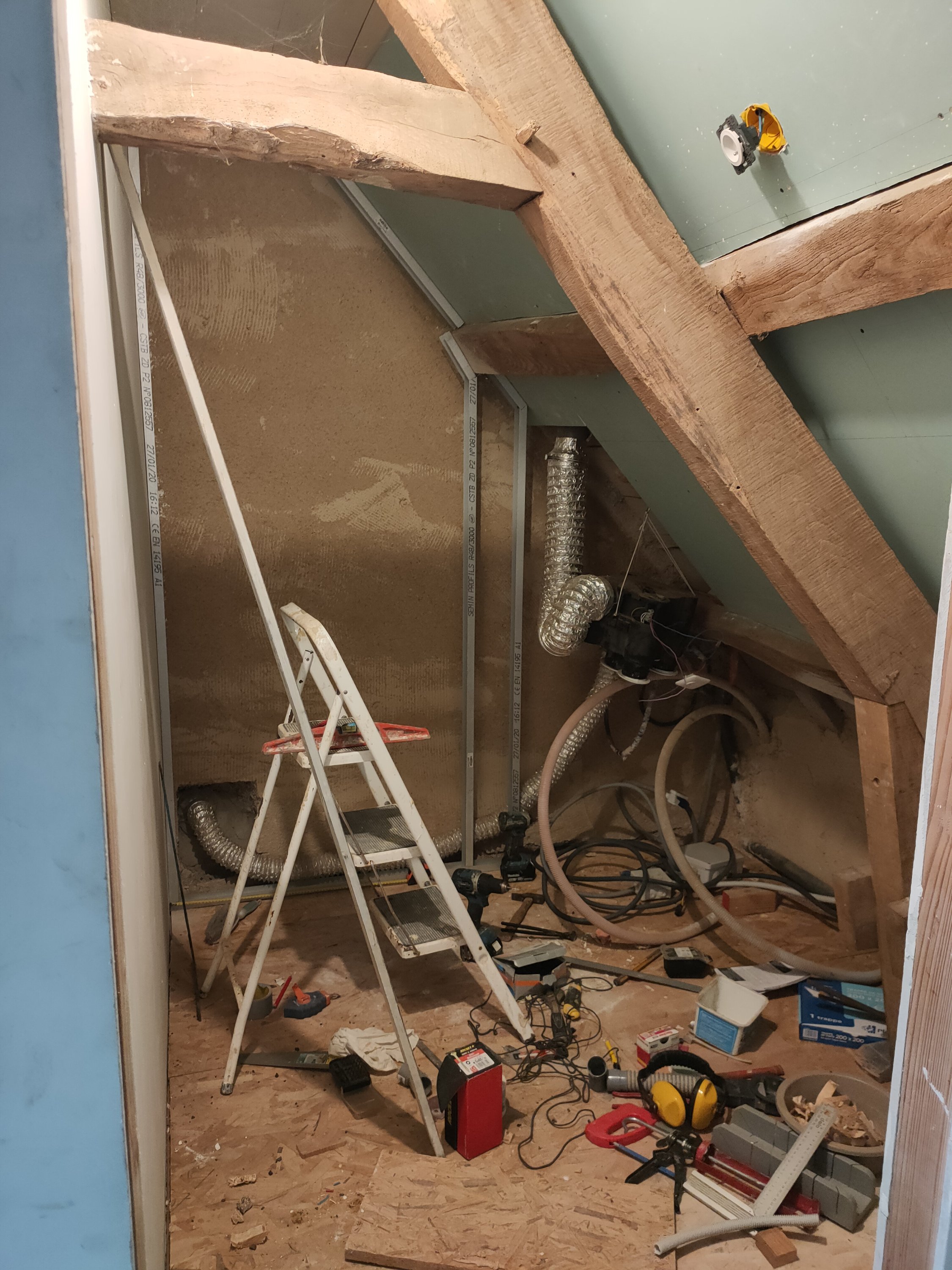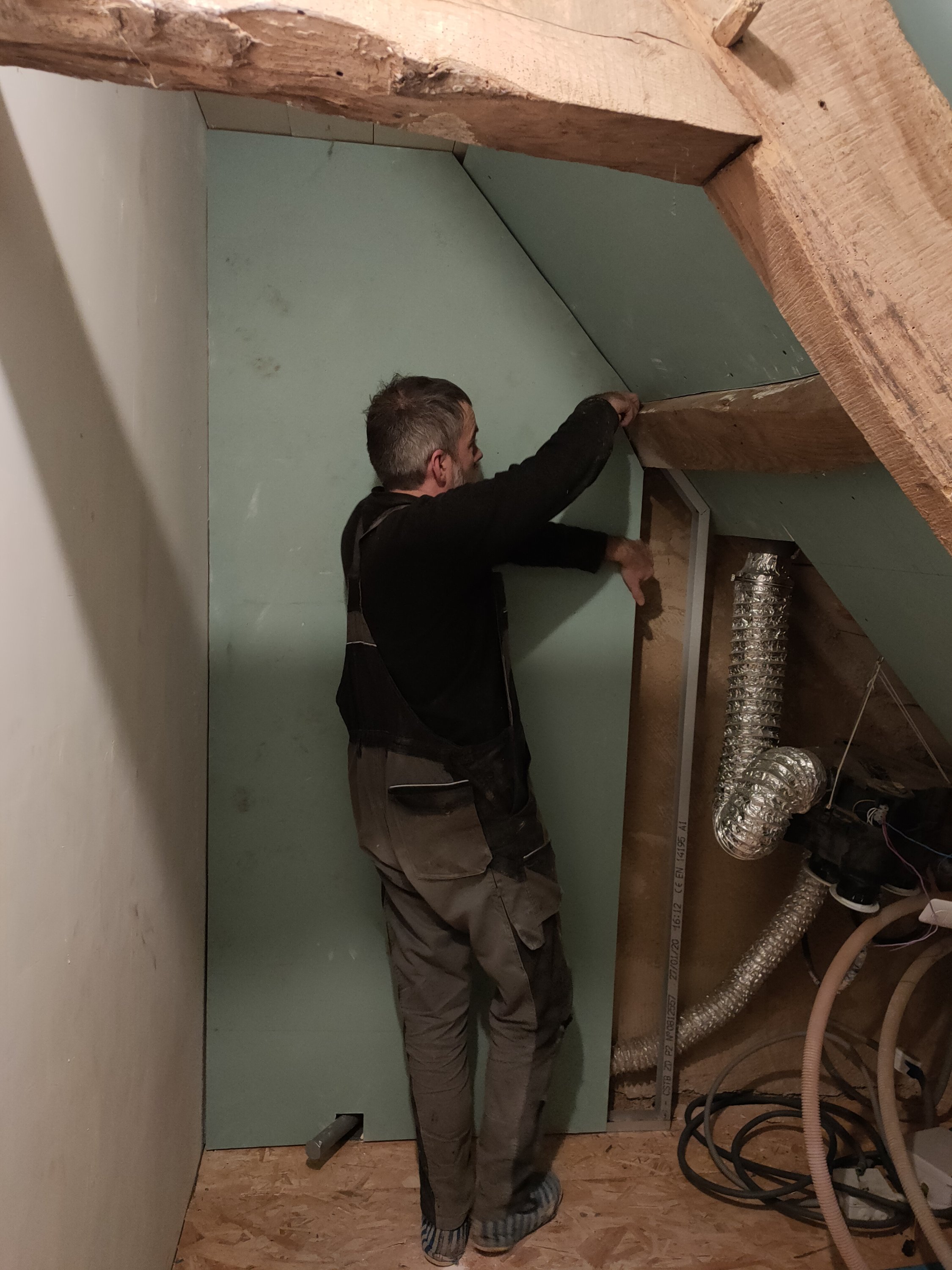 Le plus long et fatiguant était surtout de déplacer et changer les échafaudages, car il y a 4 pans de placo sur la pente du toit : une à faire assis au sol, une debout, une debout sur l’échelle plate et la dernière sur les tréteaux de maçon la tête dans la faitière.