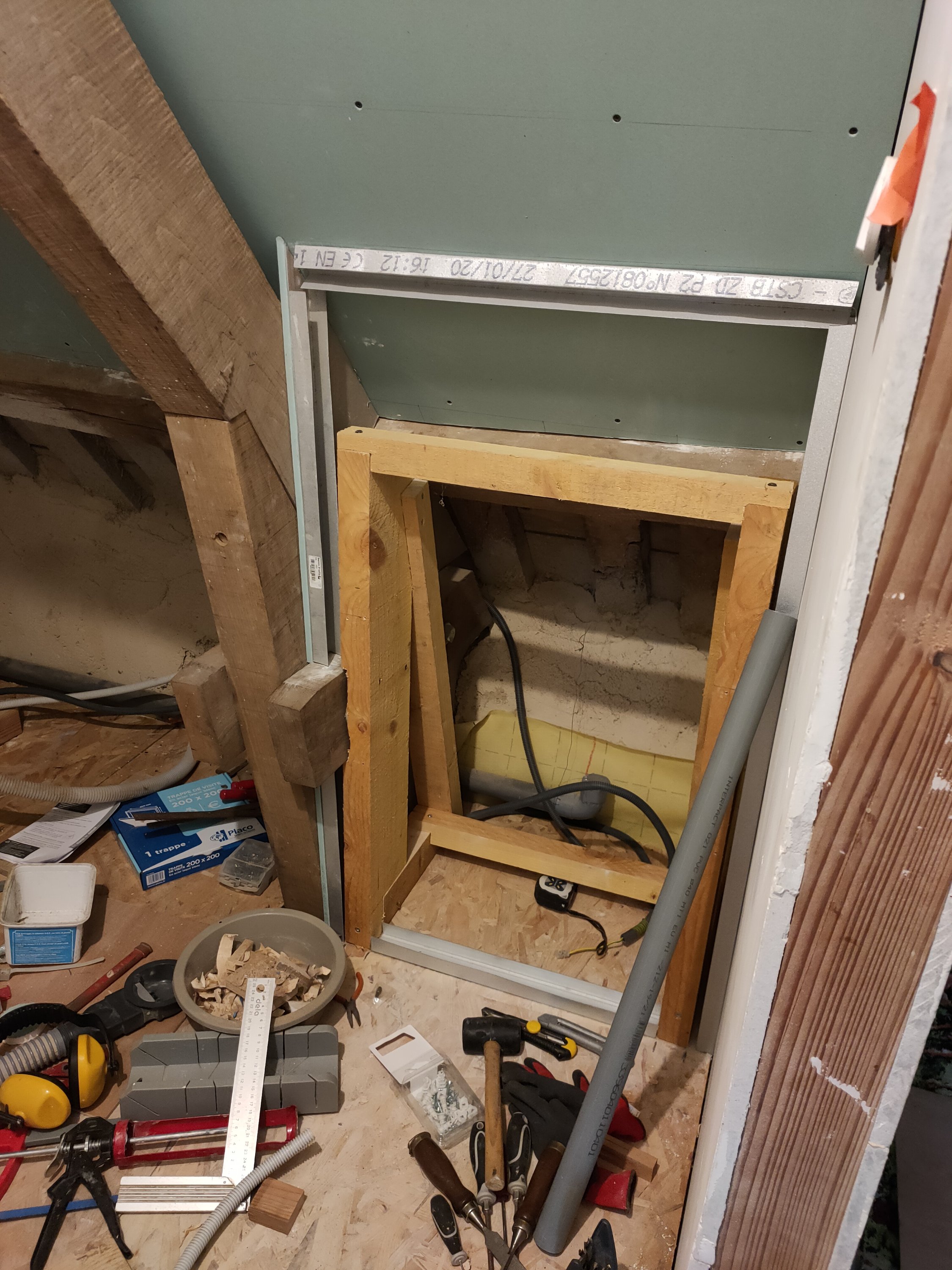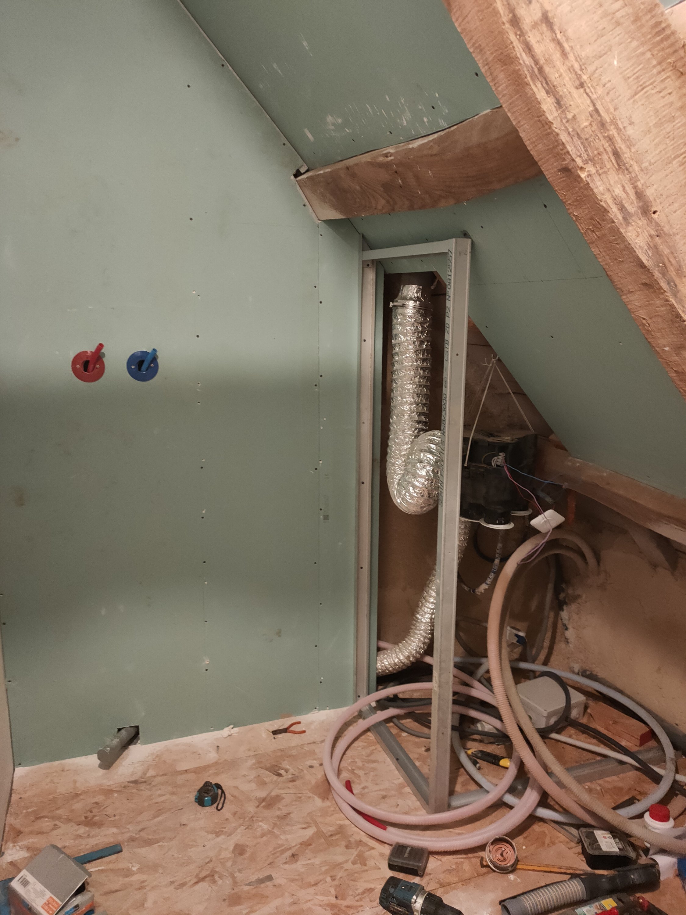 Une fois le sol installé, Gwen a posé le placo, puis a commencé les caissons pour la vmc, et la structure sur laquelle posera le lavabo (un peu lourd).