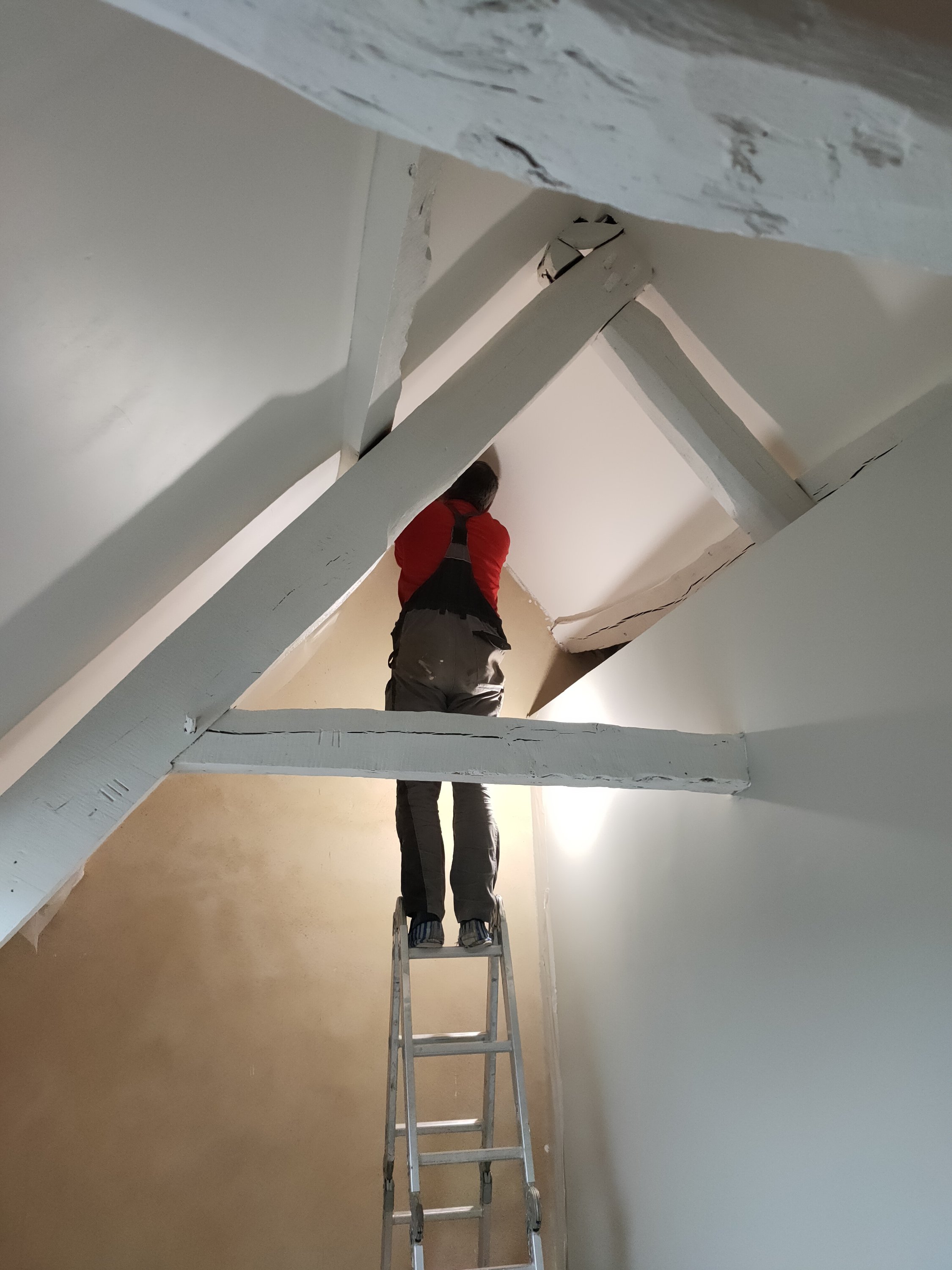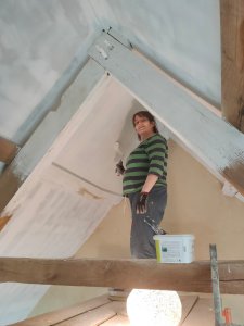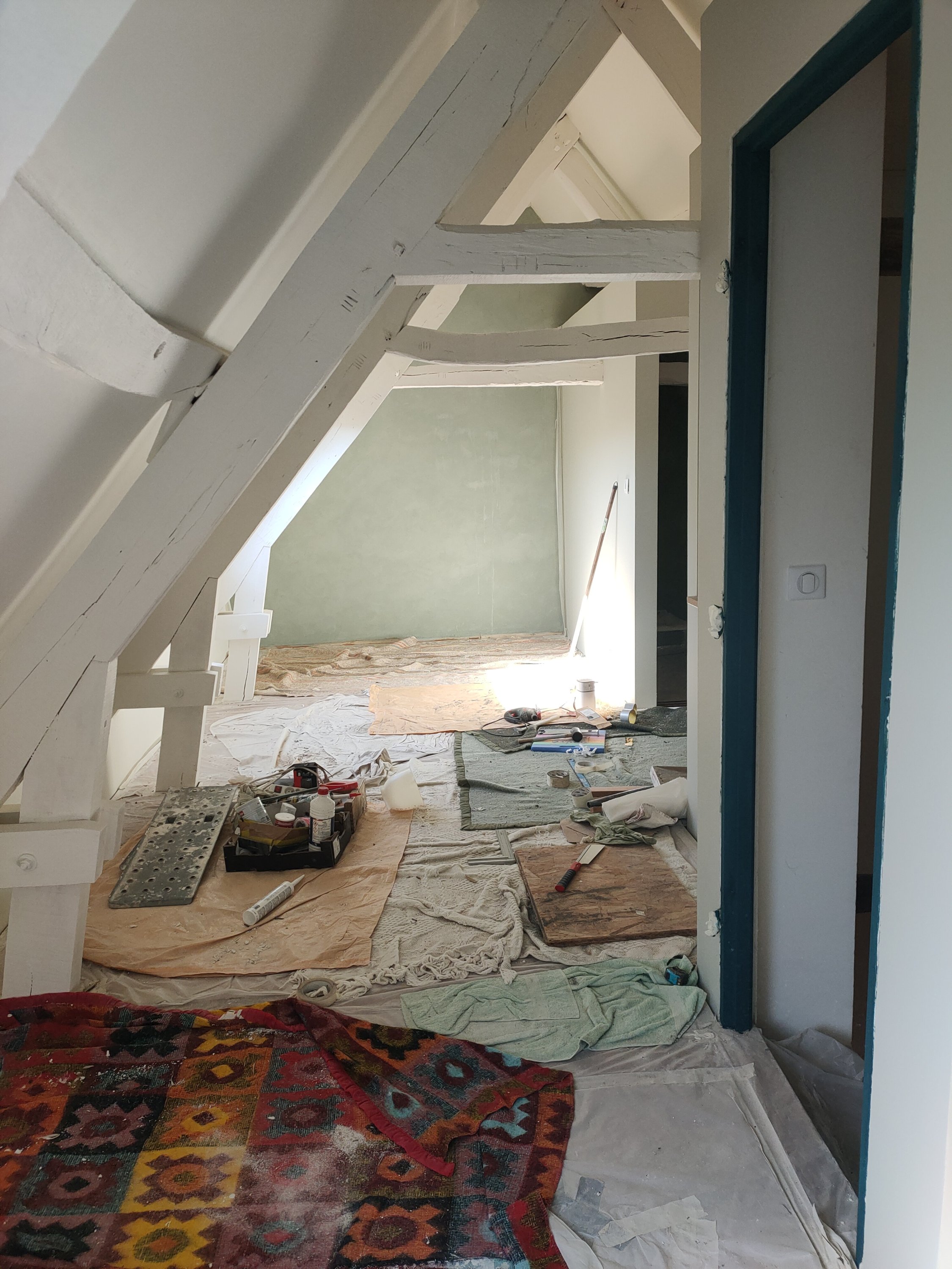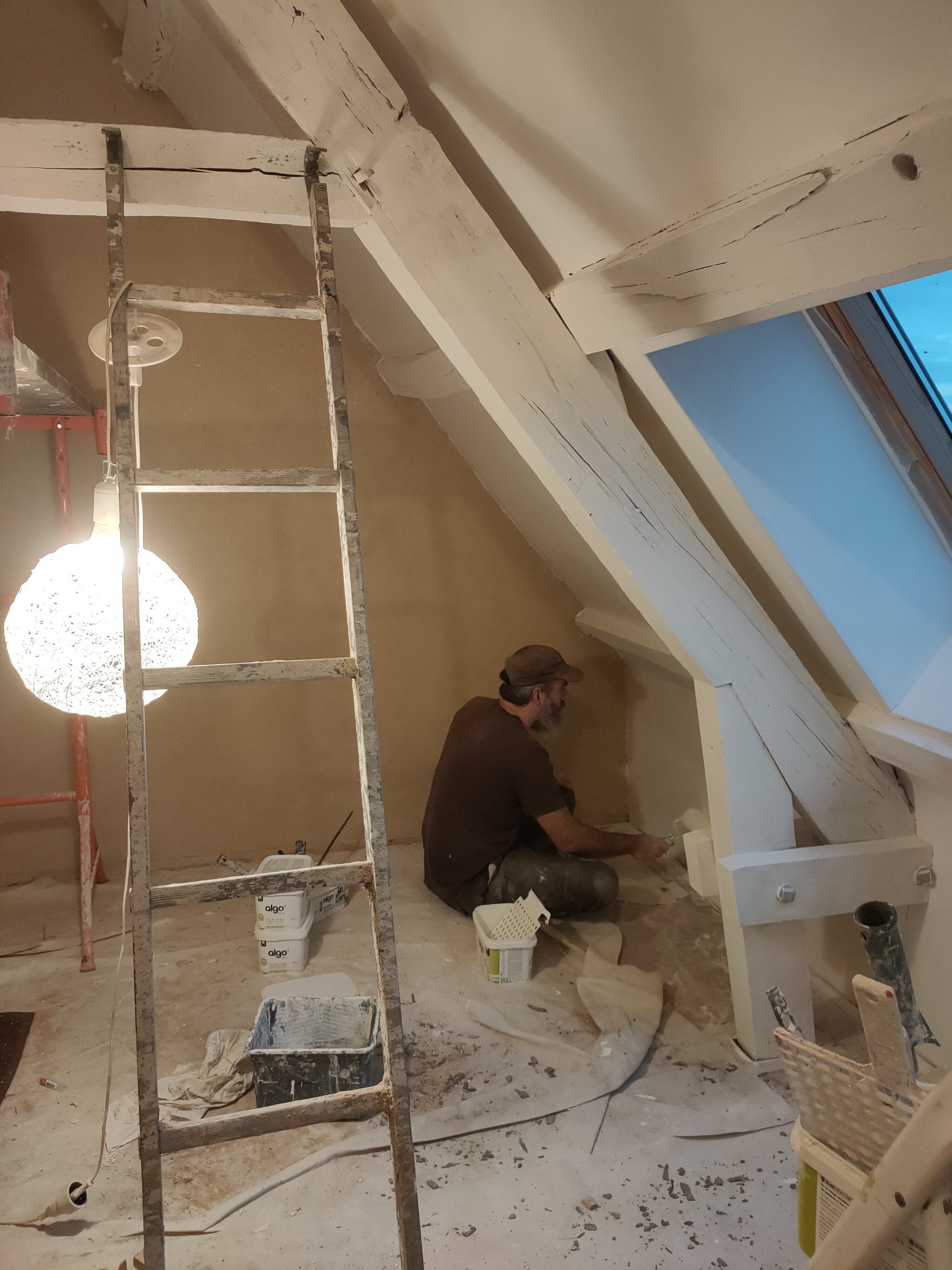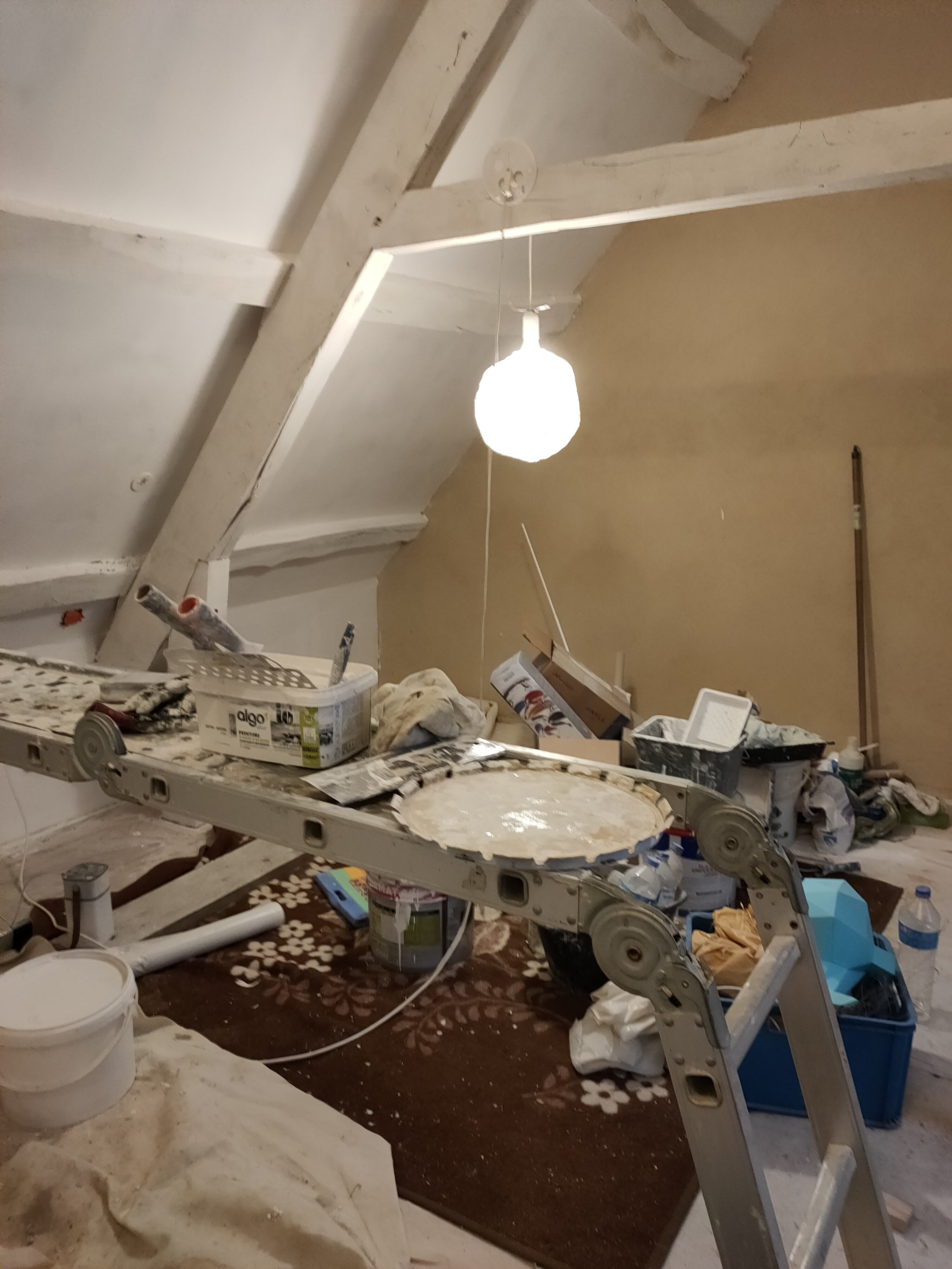 Côte peinture, comme les enduits étaient finis, je suis passée à la peinture (ça j’adore). La charpente en sous couche bois, le placo en sous couche placo (original).