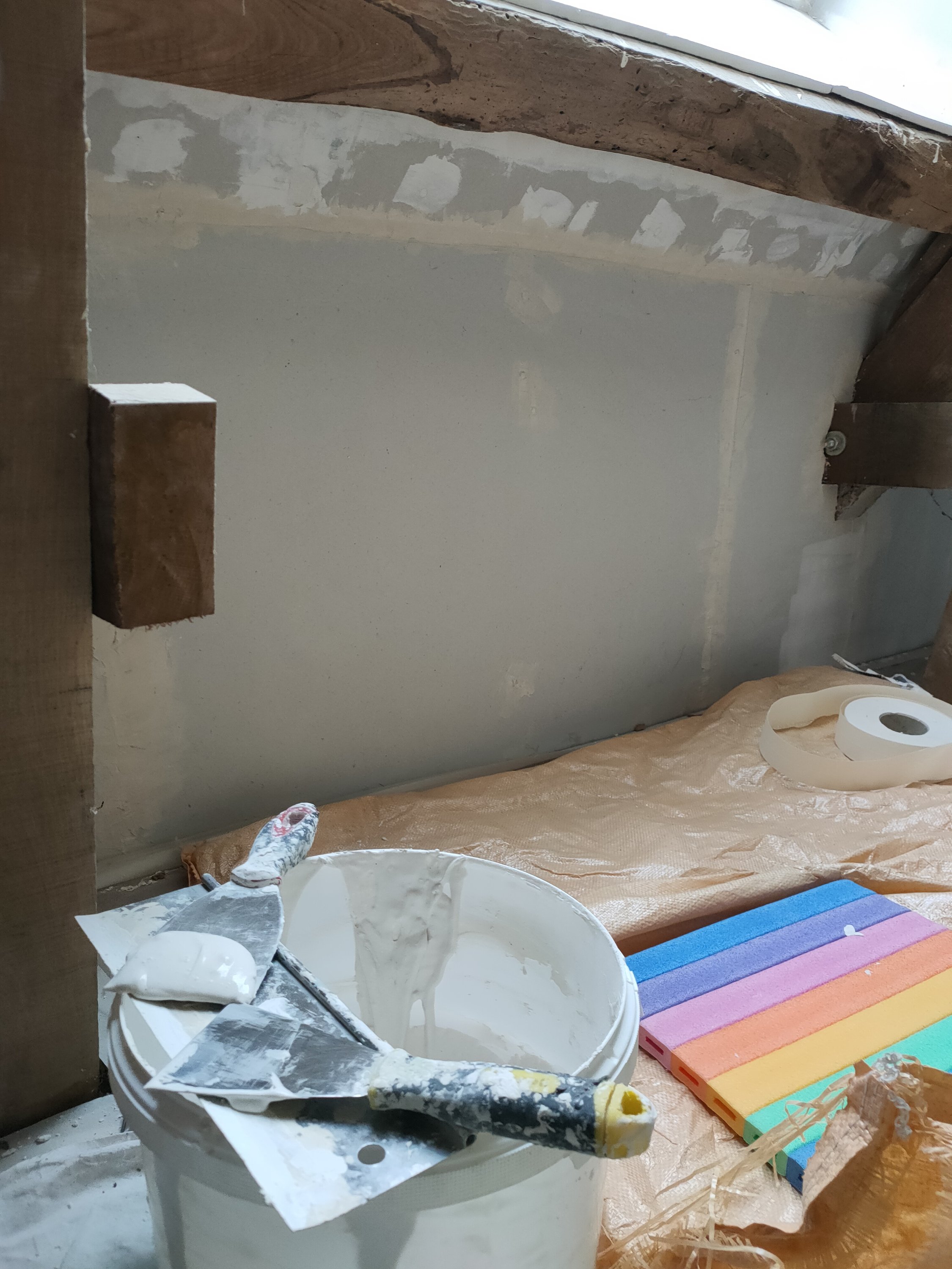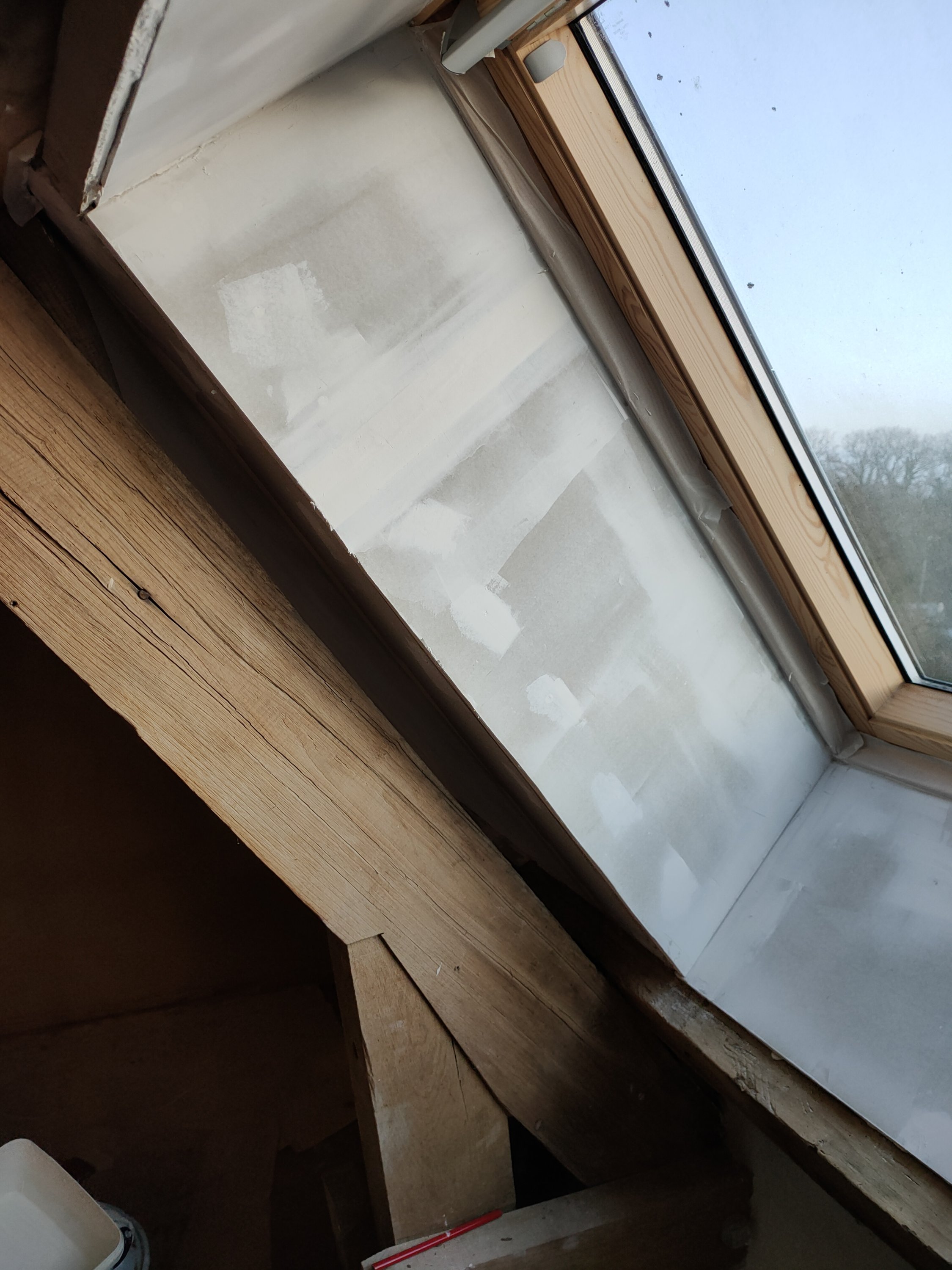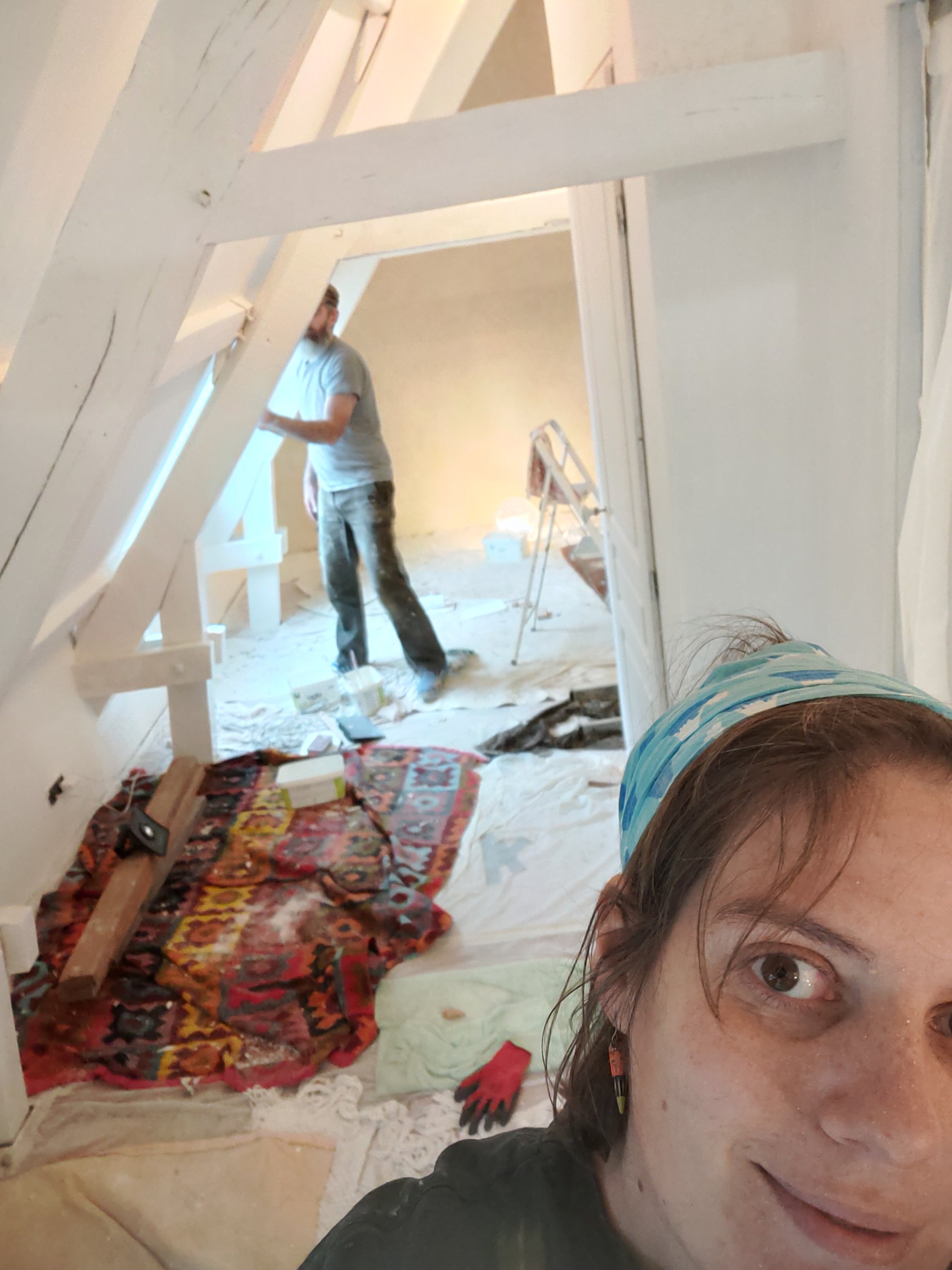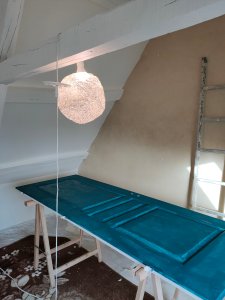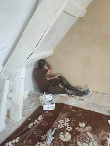 Côte peinture, comme les enduits étaient finis, je suis passée à la peinture (ça j’adore). La charpente en sous couche bois, le placo en sous couche placo (original).