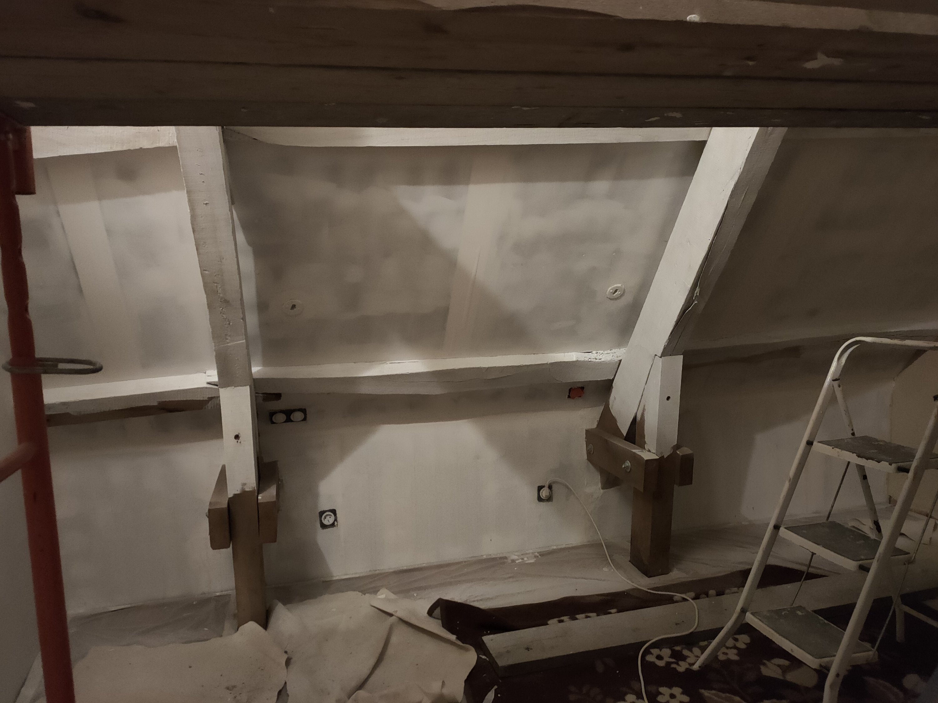 Nous y sommes depuis le mois de novembre, mais le rythme c’est accéléré depuis un petit mois, le grenier se transforme en chambre doucement mais sûrement.