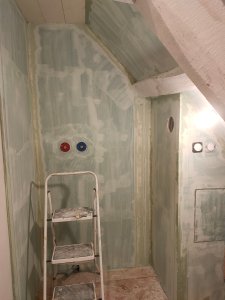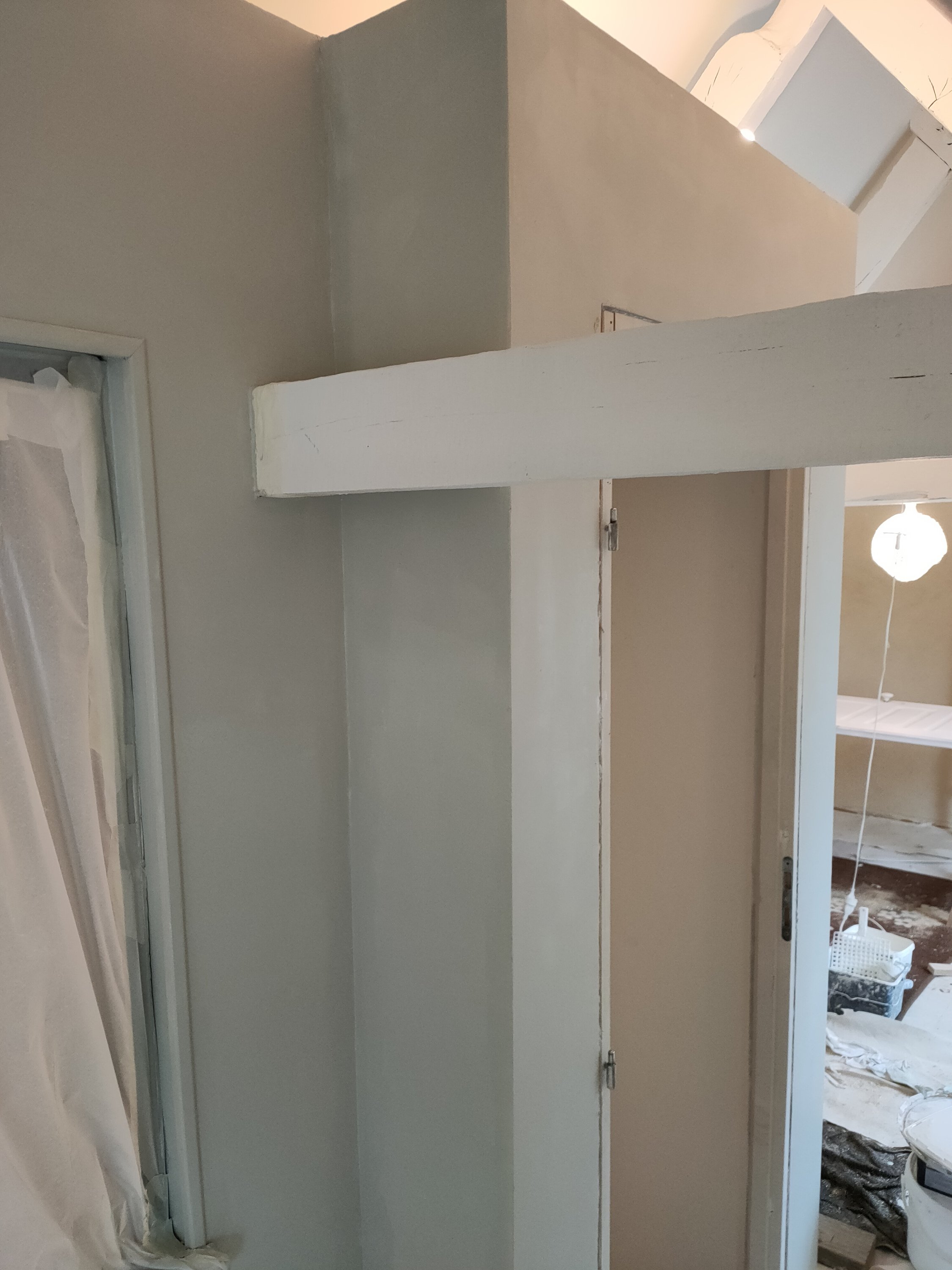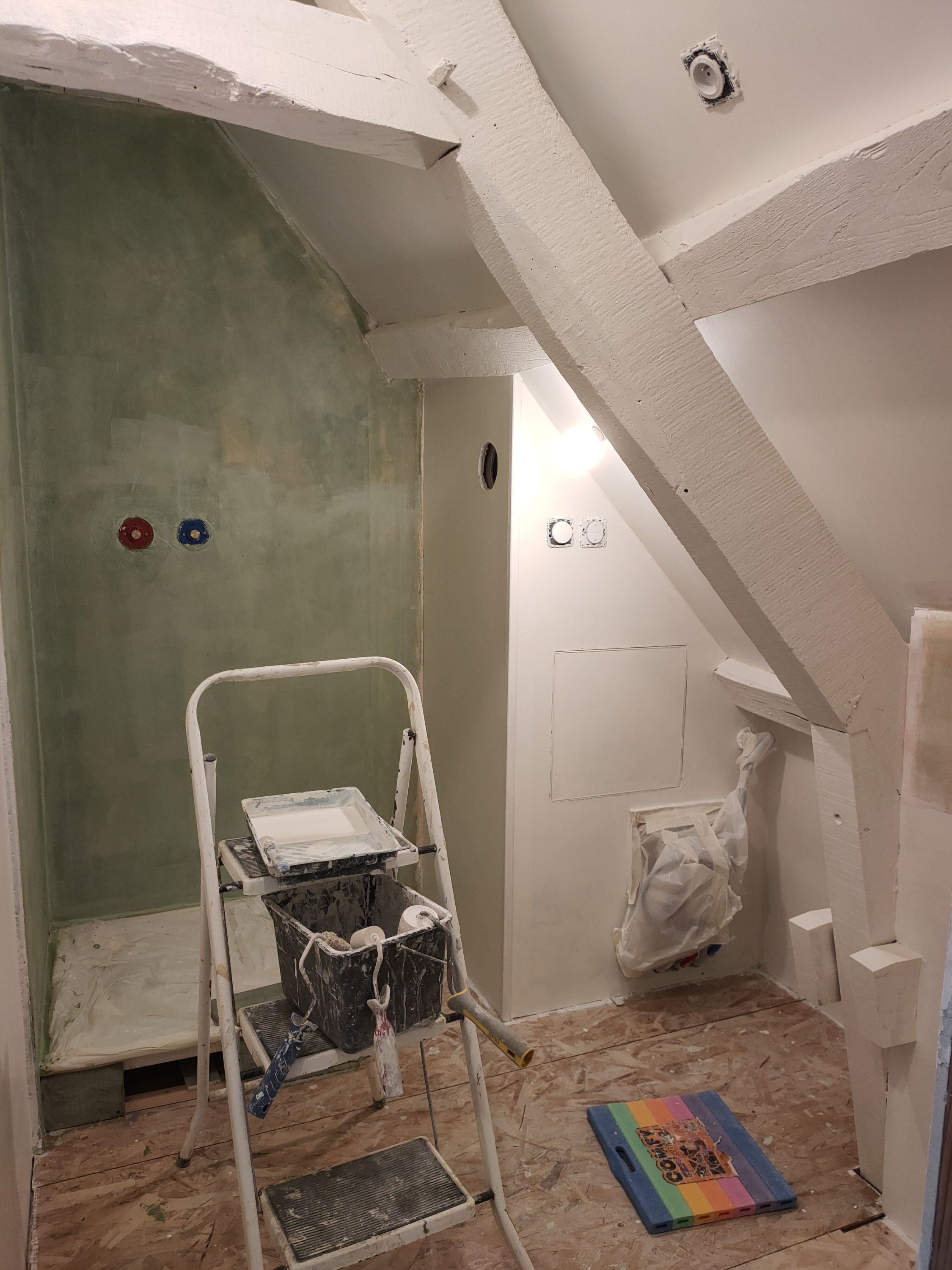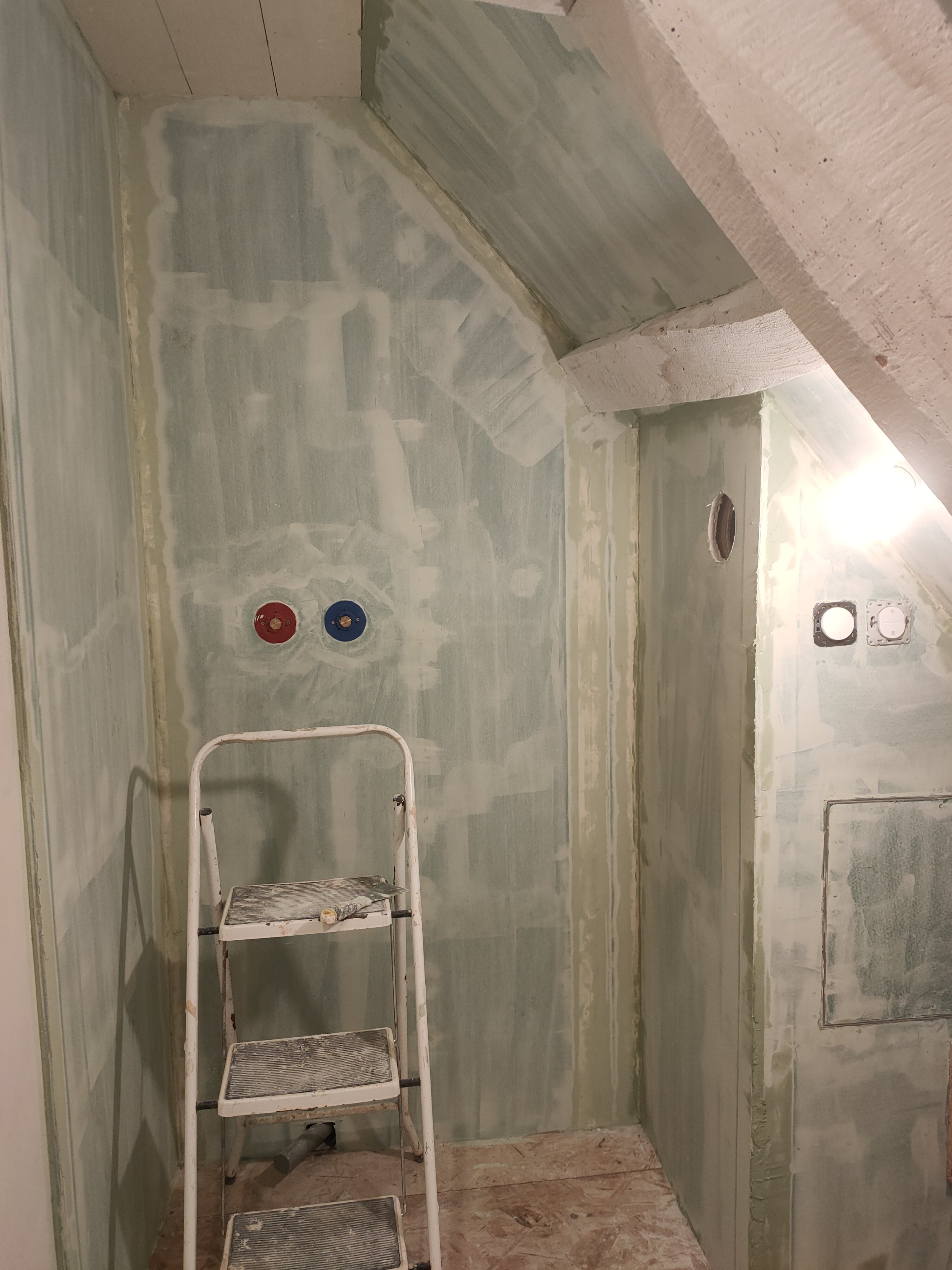 Une fois le placo posé j’ai pu faire une pause peinture pour enduire la salle de bain et terminer les rebouchages. Gwen a posé le bac de douche et son évacuation. Nous avons aussi acheté le carrelage mais lui sera posé plus tard.
