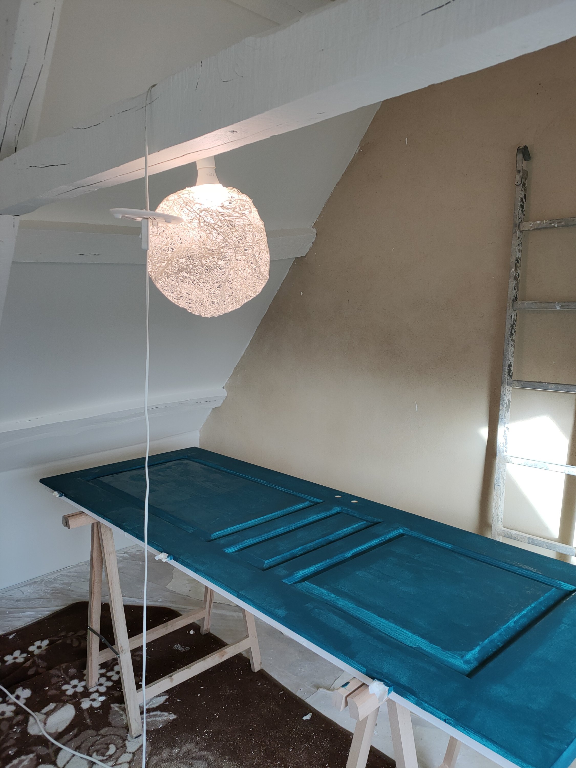On attaque la partie déco avec la peinture de la porte (peinture Libéron mate bleu pétrole).