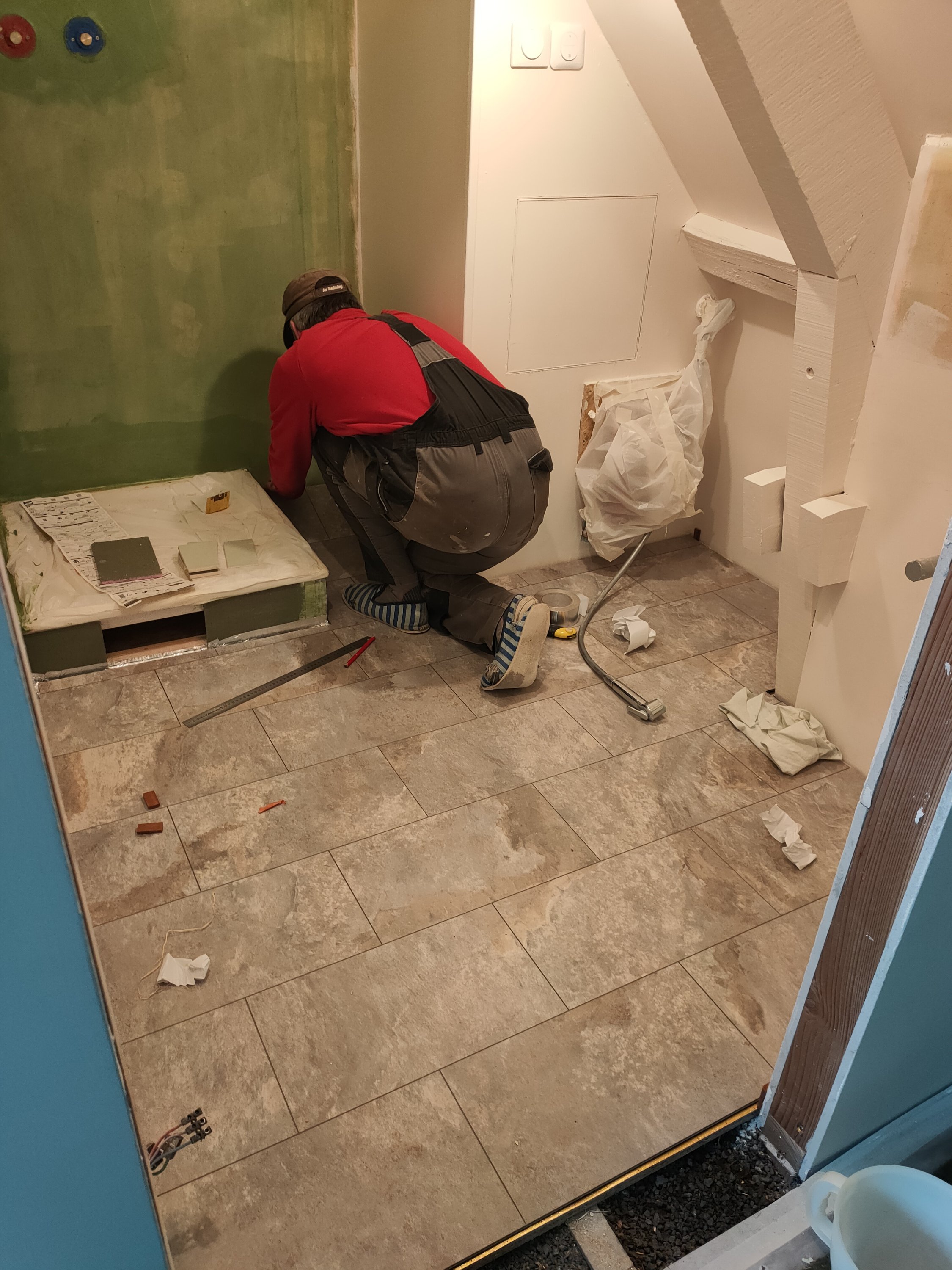 Etapes suivantes : reboucher et enduire, puis poser le bac de douche, pour peindre et appliquer l’étanchéité de la douche.