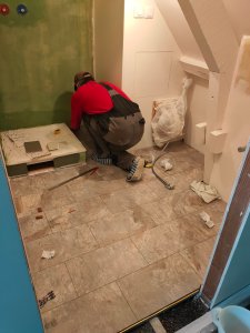 Acheté en même temps que le bac de douche et maintenant la peinture faite, Gwen a posé le sol définitif de la salle d’eau.