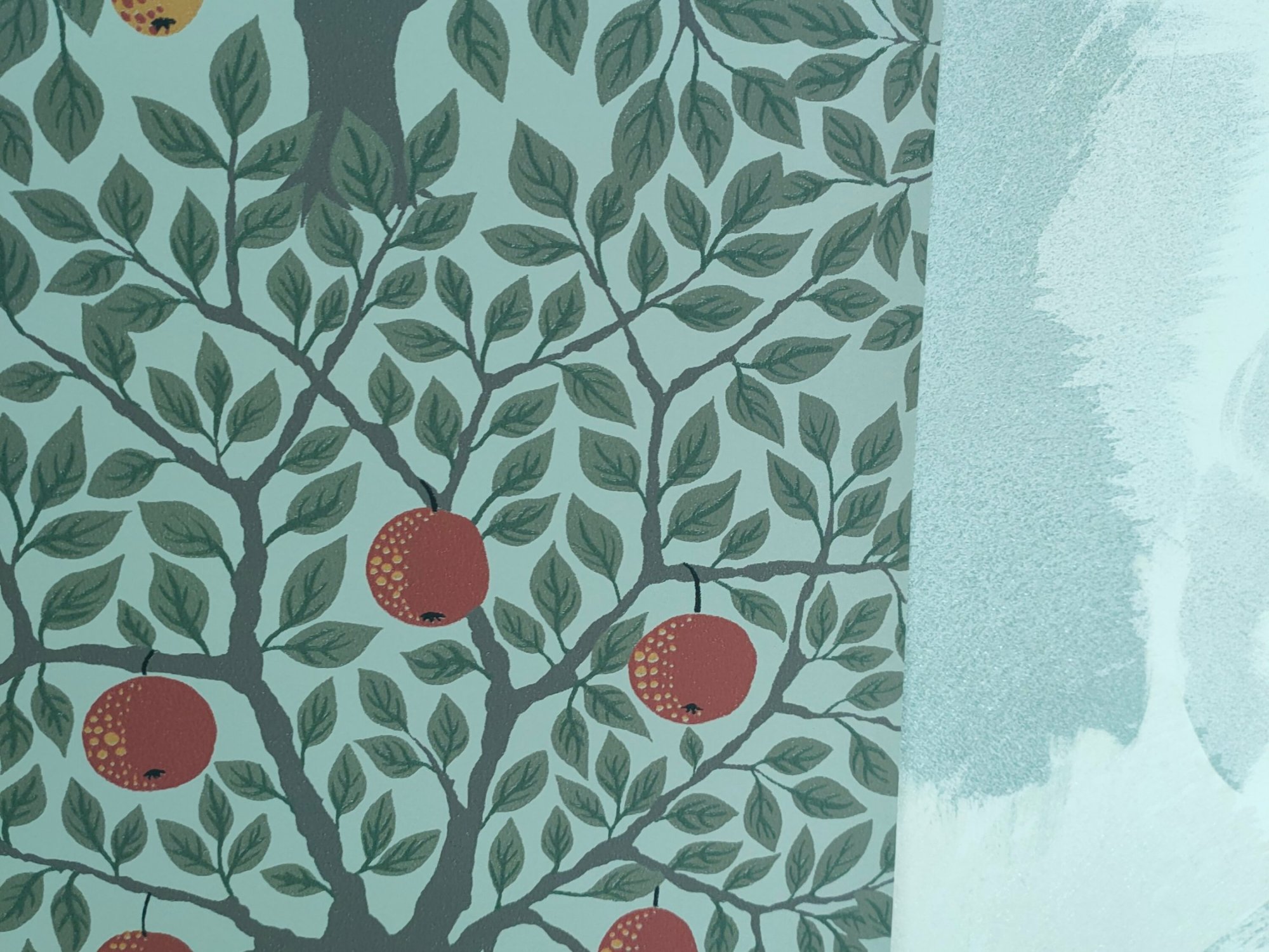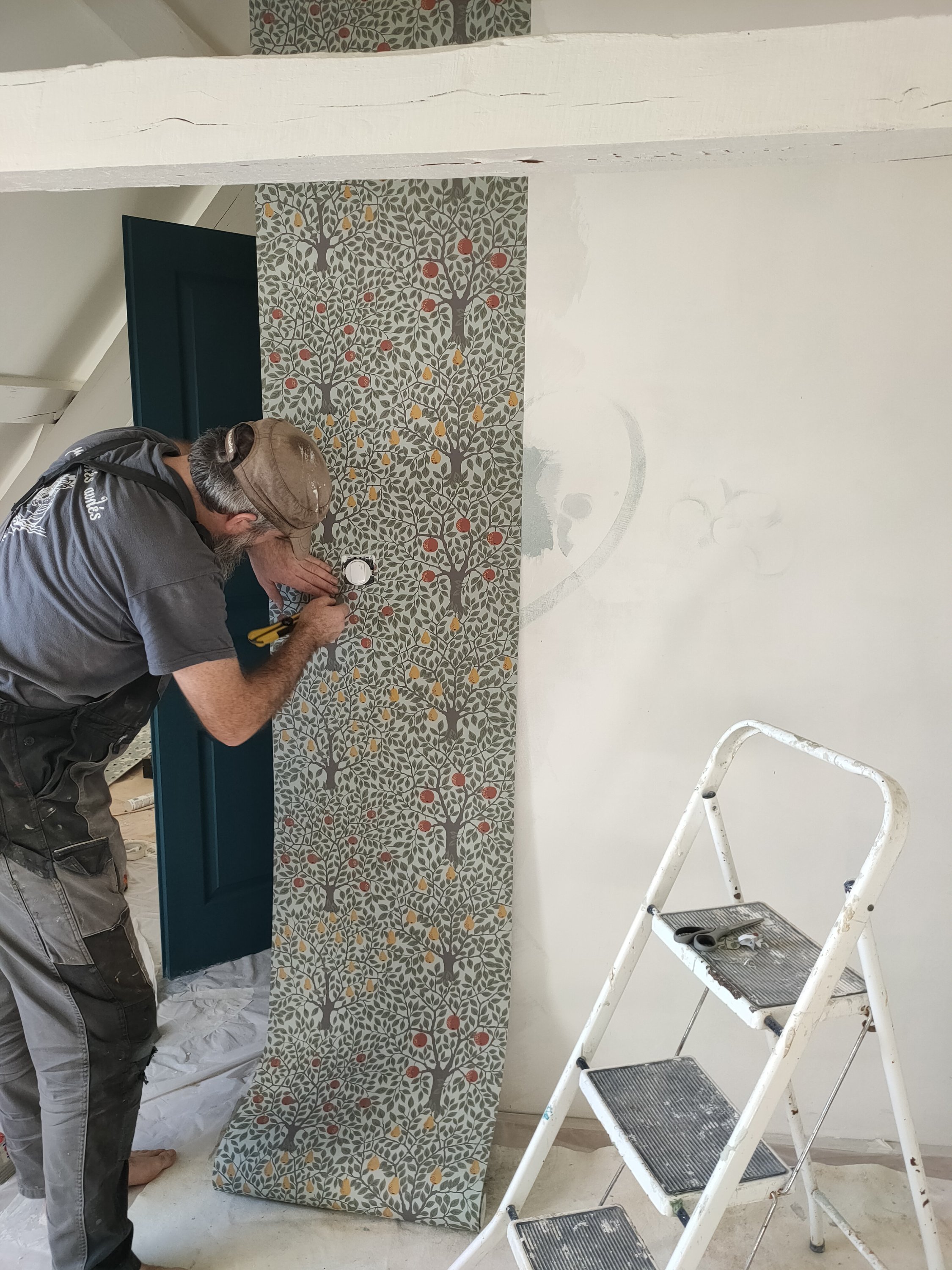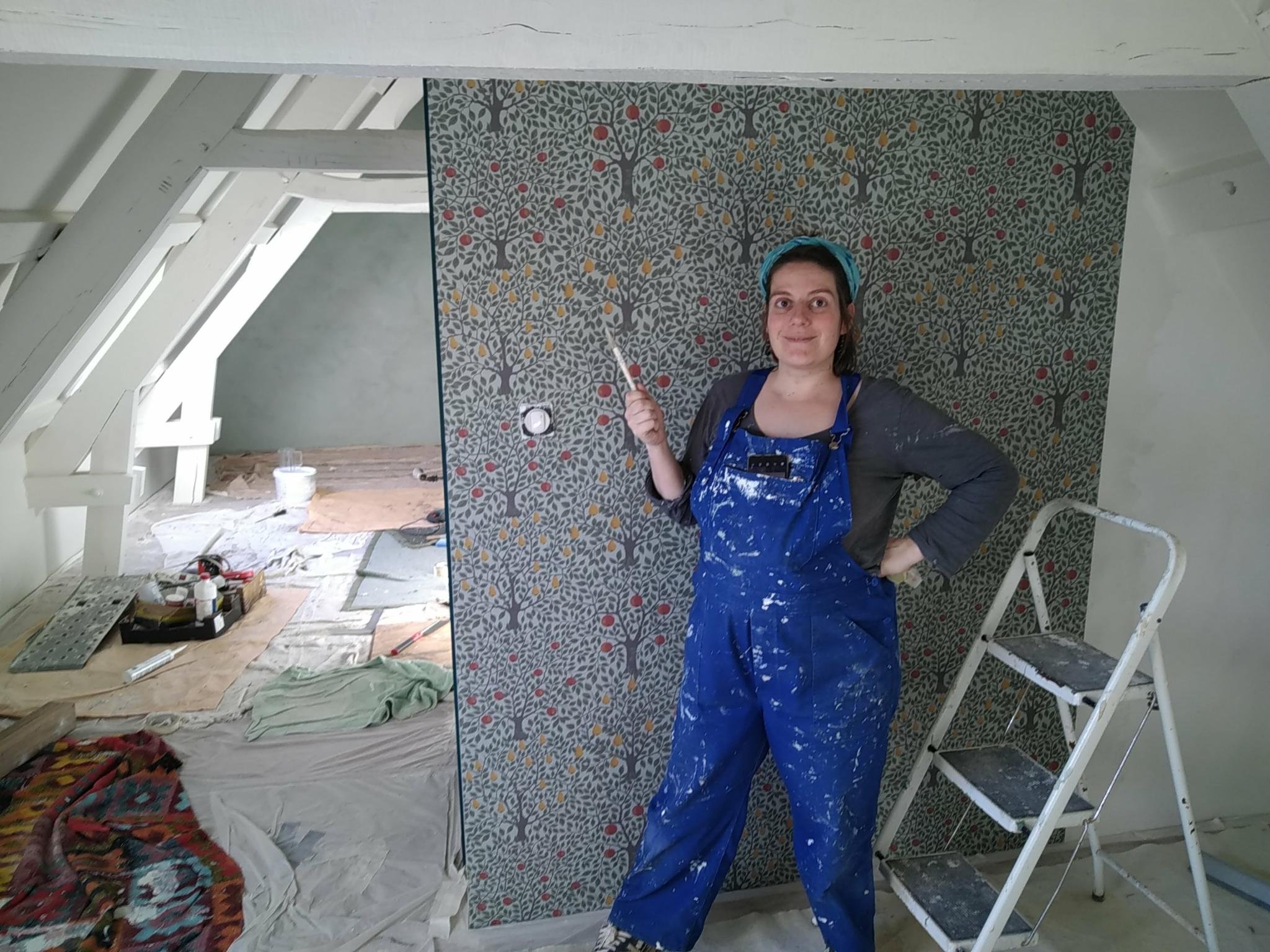 Nous avons trouvé une peinture à la chaux appliquée sur une couche de fixatif pour assurer le revêtement (peinture Galtane couleur marais). Et clou de la déco, nous avons posé du papier peint sur le pan qui sera le plus proche de notre lit.