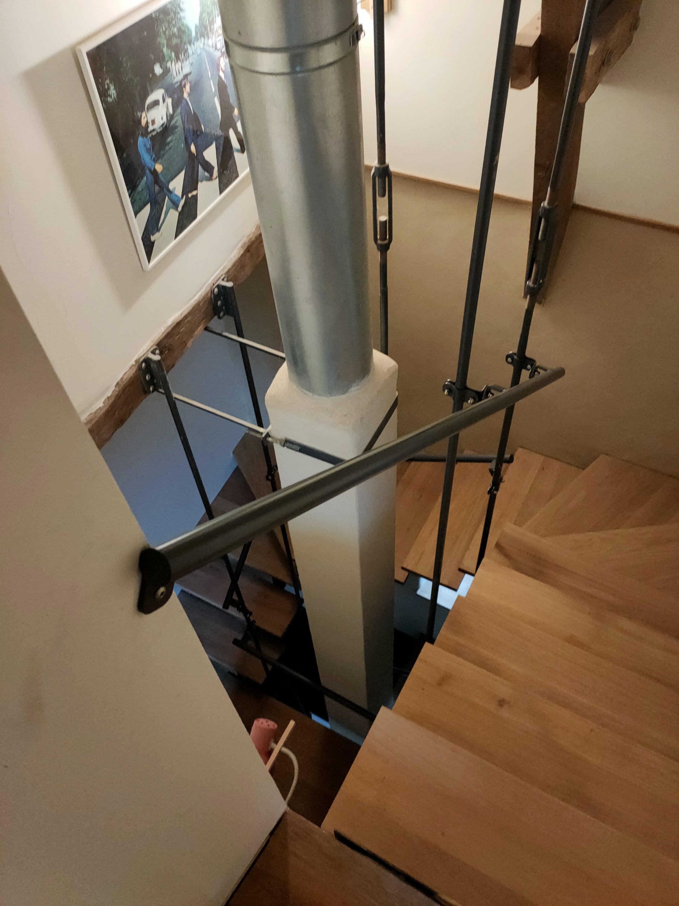 Deuxième étape de la finalisation de l’escalier, les mains courantes ont été posées.