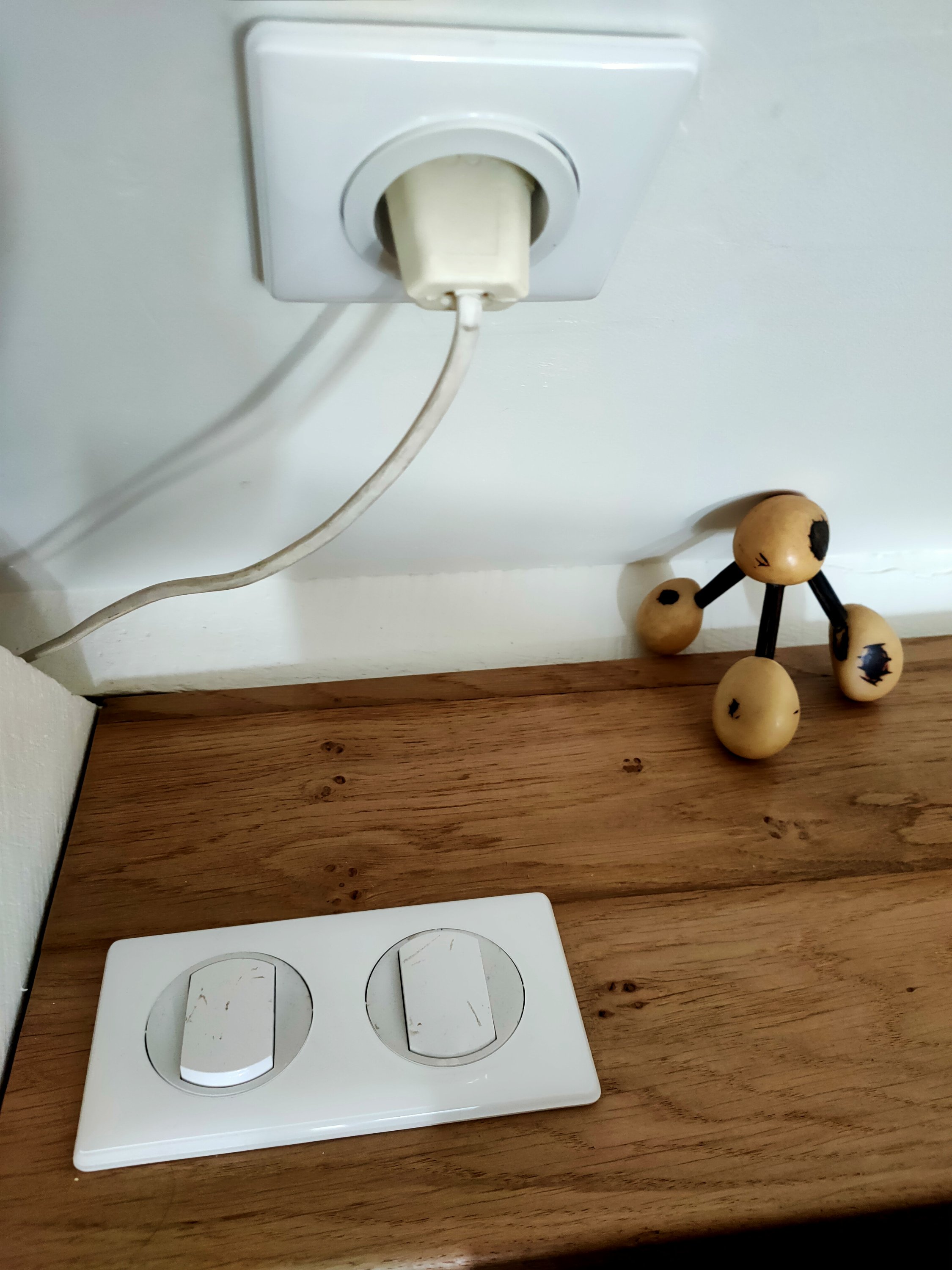 La tablette a été composée avec trois restes du plancher, assemblés puis sur la qu’elle nous avons installé les interrupteurs. Top confort pour la nuit.