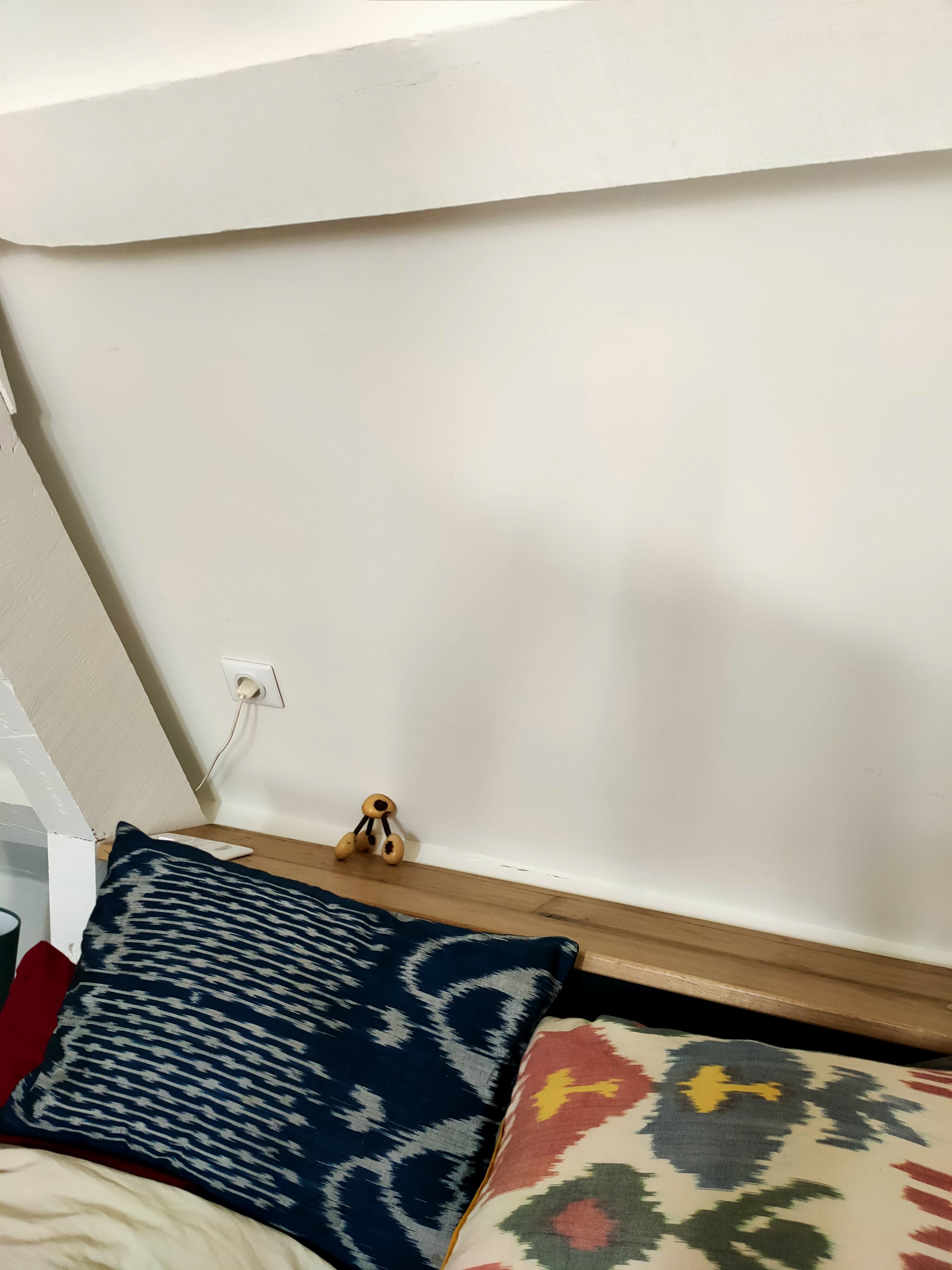 Les dernières étapes pour le grenier. Avant que nous ne rentrions de Morlaix, Gwen avait installé une tête de lit provisoire. Une fois rentré et après une légère adaptation de notre vie, nous avons terminé la tablette de la tête de lit, qui a été fixée définitivement.