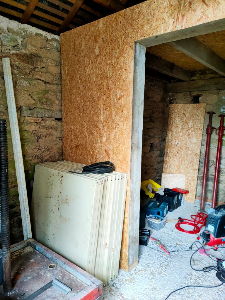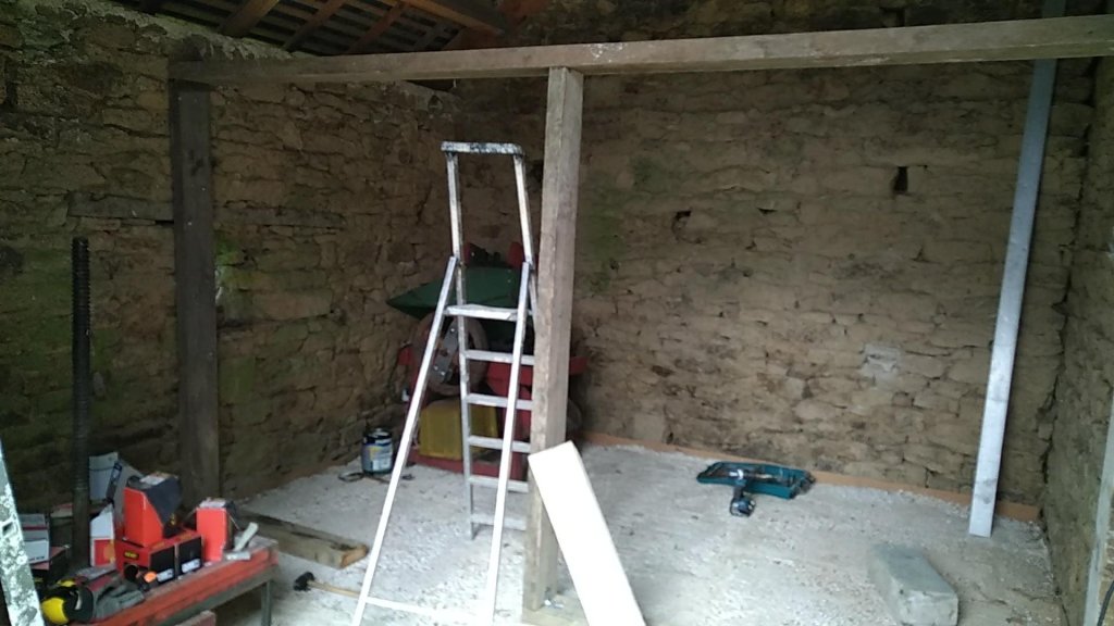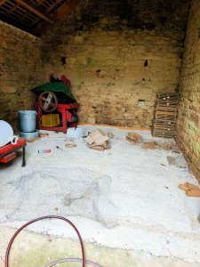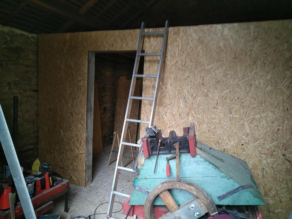 - De l’autre côté dans la grange : l’atelier de bricolage, pour vider le haut de la longère, au fond on garde les stocks de briques, carrelages, … avec les poudres, au centre un établi et devant les outils.