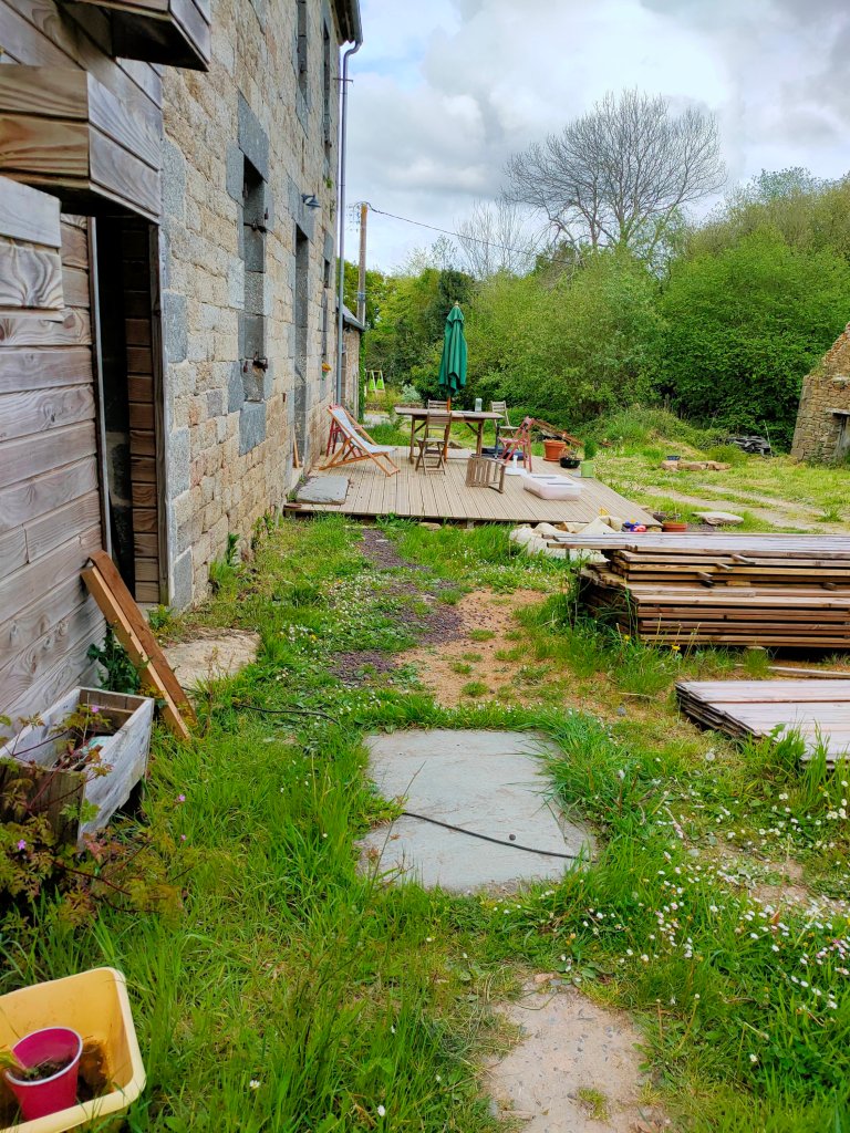 Mai 2023 : il reste un mini big bag, on a ajouté du bois pour le bardage en stockage, mais on un petit chemin, un jasmin tout content (mais qui va encore bouger), et une belle terrasse.