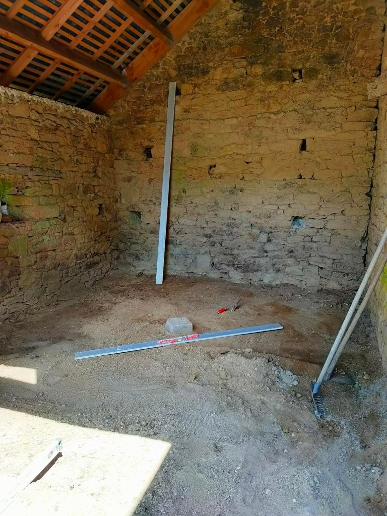 Début d’été 2023, nous avons tout vidé, gratté un peu le sol pour couler une chape au propre avec un mélange chaux/pouzzolane.