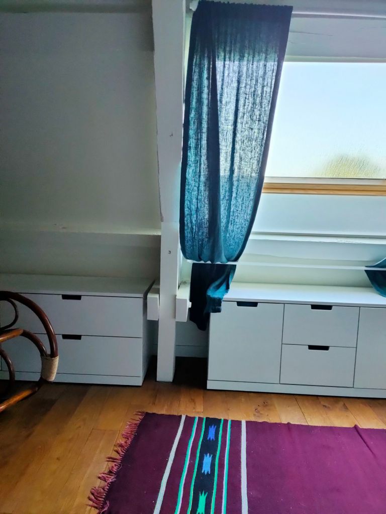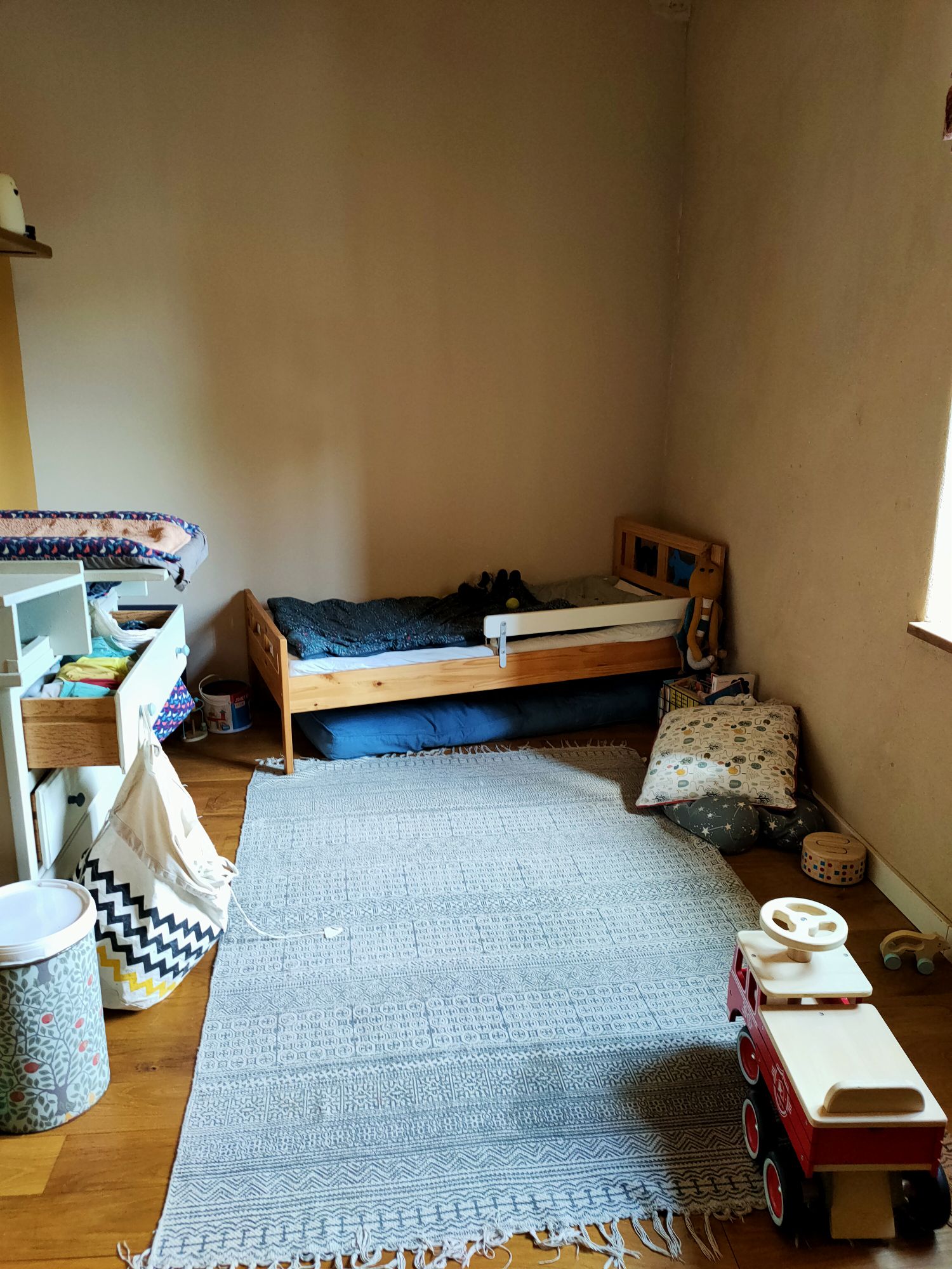Fini les barreaux, place au lit de grand, en deux étapes avec un petit matelas en dessous pour inviter un copain prochainement …
