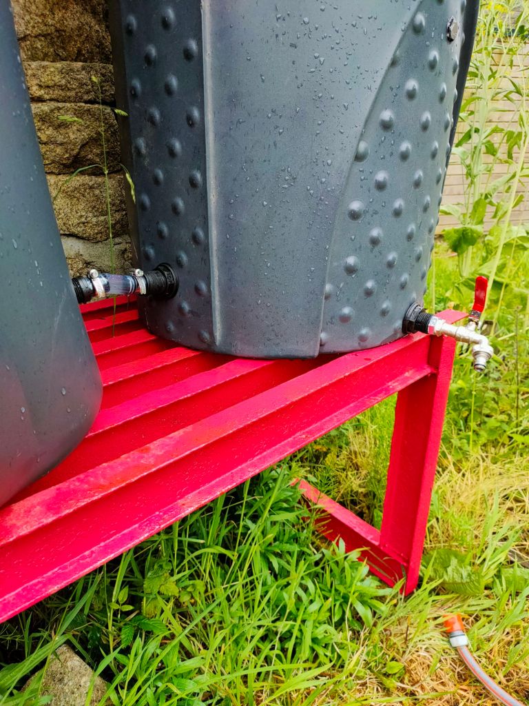 Restait à trouver un bout de tuyau pour tester le branchement et sans pompe, le goute à goute fonctionne en gravitaire, sans plus d’effort que d’attendre la pluie tombée. Certes la pression est moins forte et le débit plus doux mais pour apporter un peu d’humidité au pied des tomates ce n’est pas bien grave et le risque d’oubli du branchement ouvert est bien moindre (au pire on vide la cuve …).