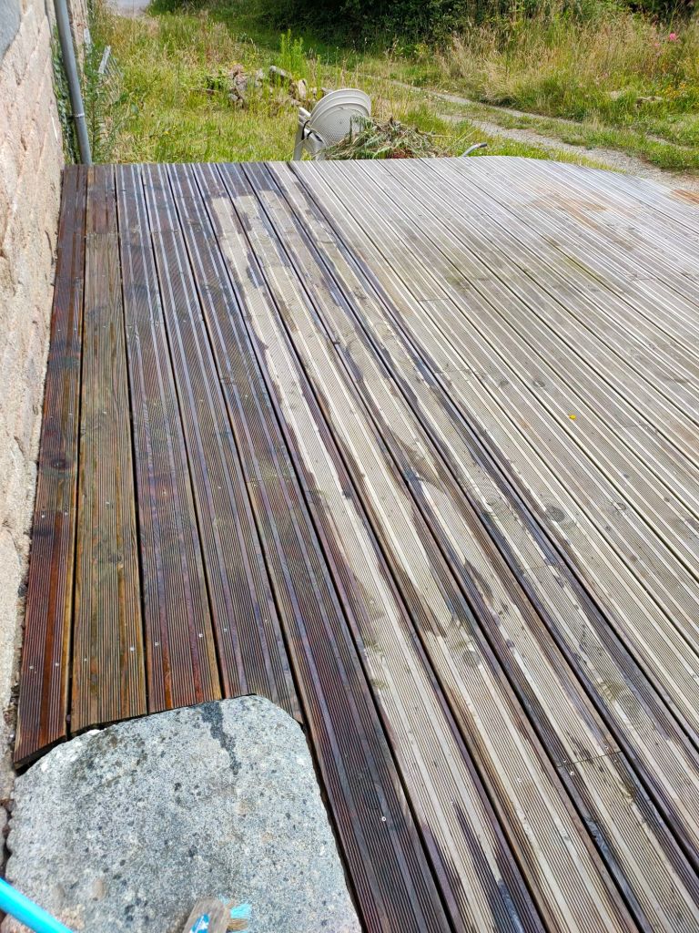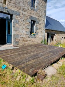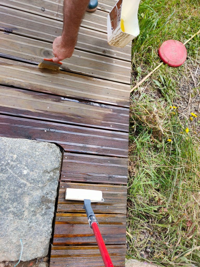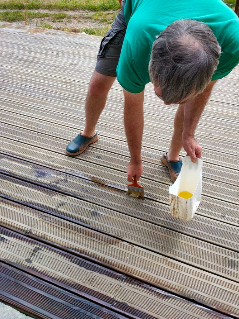 Les beaux jours (ou presque) imposent la petite maintenance d’été : huile de lin/térébenthine sur la terrasse.