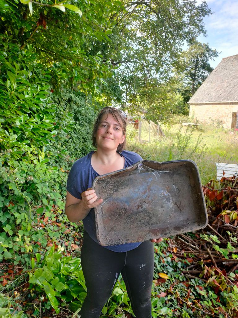Et puis alors que je m’acharnais à tirer dessus, couper les racines du lierre, un bruit étrange résonnait sous mes pieds : un coup de pioche plus tard et nous sortions un lèche frite issue d’un four qui ne doit plus fonctionner depuis bien longtemps.