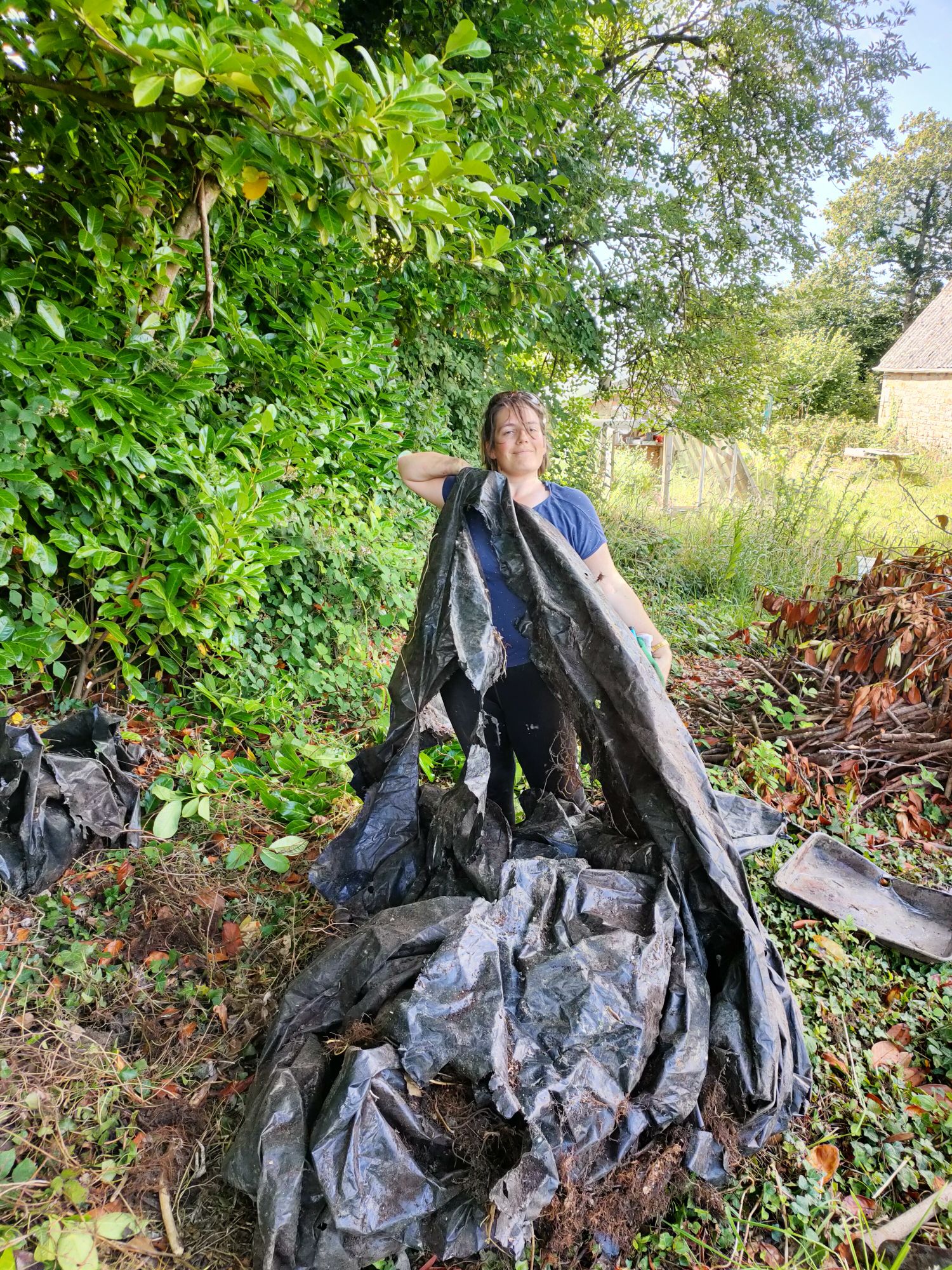 On avait presque oublié cette sensation de retirer d’un coin du jardin un morceau de déchet : belle découverte libérée après un passage de tondeuse, un énorme rouleau de bâche agricole, dont le laurier s’est servit comme coussin il faut croire.