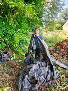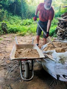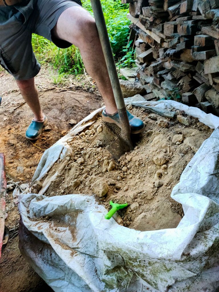 Pour réinstaller le tas, il faut commencer par faire de la place. Alors Gwen s’est lancé dans une petite mission : vider les deux big bags de reste d’argile (ayant servie à faire nos briques) pour créer un renfort derrière le hangar.