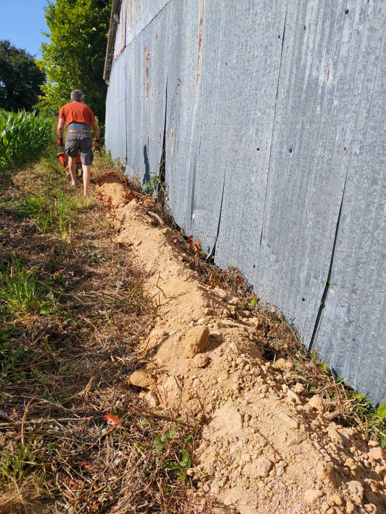 Après avoir installé des branches comme sous bassement, il a déversé à la brouette le premier big bag. Objectif : faire une petite butée pour limiter les déversements de flotte du champ pendant les grosses pluies. Jusqu’alors, le sol du hangar est détrempé à la moindre pluie, et tout ce qui est dedans prend l’humidité par le sol.