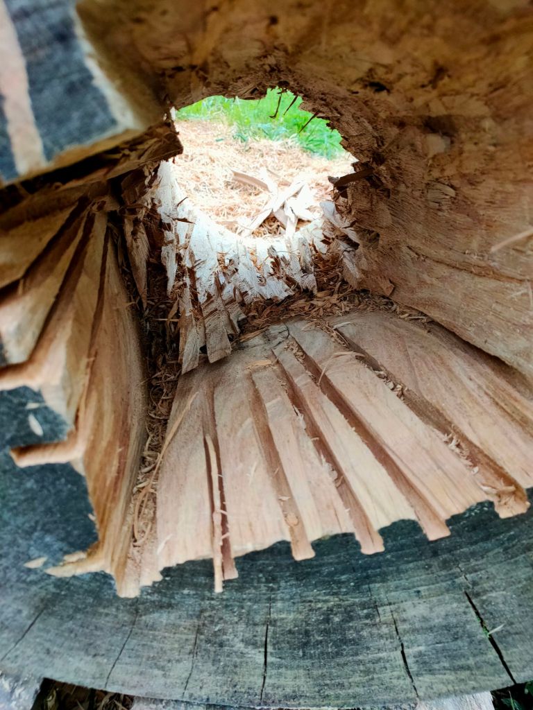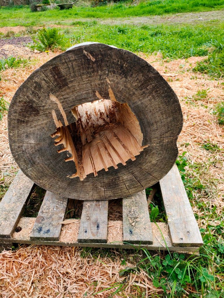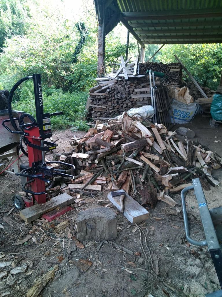 Merci la « Guingamp-machine » ou fendeuse prêtée par Sophie. Magie de l’outil mécanique qui part son verin arrive au bout des plus grosses sections. Nous avions un joli tas de cas de castor dans le haut de la court en attente depuis … bref.
