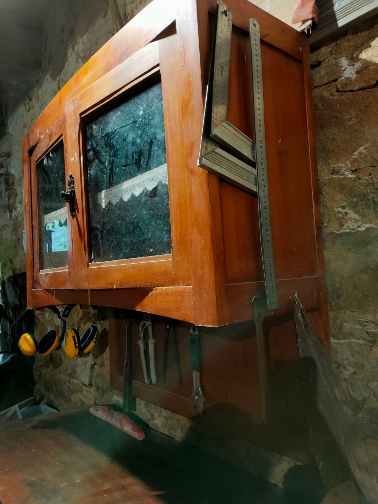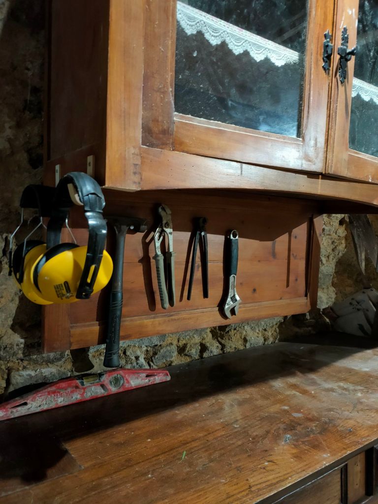 Les principaux outils ont été rangés dans les étagères en plastique dans le coin, mais manque de praticité pour les outils à main, les vis, les protections, … Une idée et un tour dans notre stock dans la longère, pour y retrouver ce haut de bahut (le bas a été transformé en meuble pour la salle de bain).