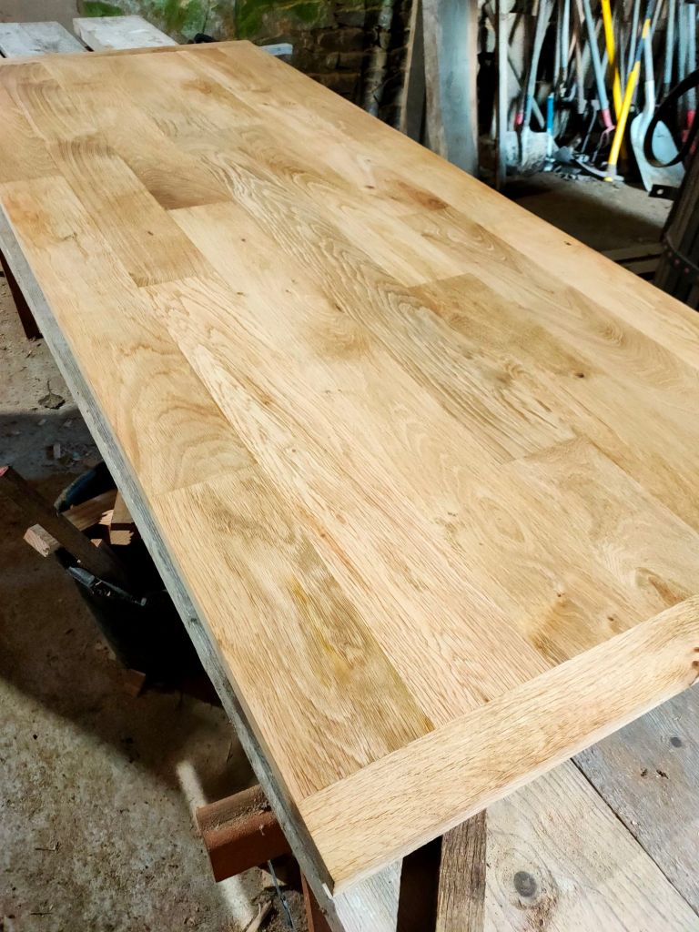 Transformation de reste de parquet en un magnifique plateau de bureau sur mesure (même si les dimensions ont évoluées) qui n’attend que son vernis et des pieds pour être installé.