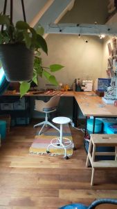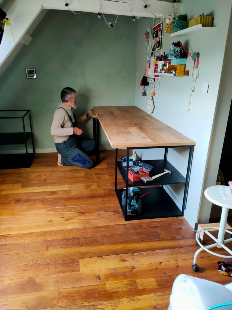 Un nouvel espace tout beau pour travailler et faire plein d’autres choses : du bois du parquet, pas mal de boulot de tomate, l’installation by gwen avec une touche de déco … c’est super !