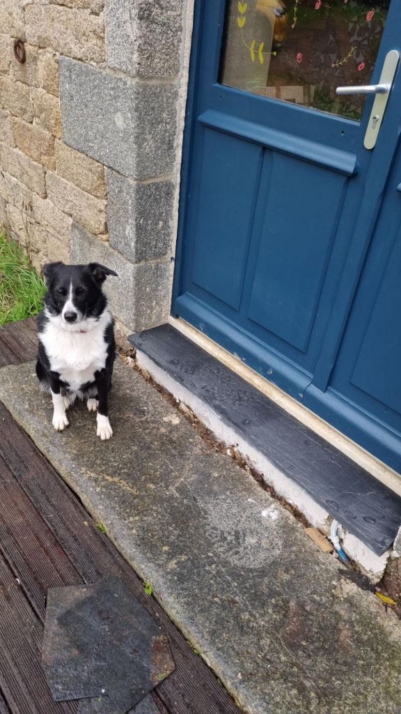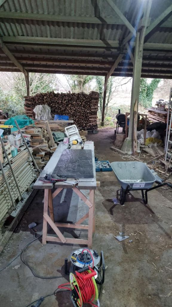 Il était temps ici aussi. Nous avons acheté ces pierres lors de la construction de l’escalier … Mais nous avions commandé de quoi refaire le pas de porte, celui de la longère, …