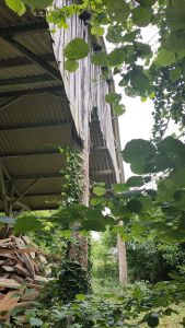 Sous une foret vierge et un tapis d’ortie, nous pouvions apercevoir le vieux bardage du côté Est du hangar.
